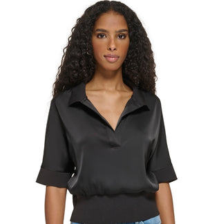 Calvin Klein Women's Short Sleeve Collared Satin Shirt Black Size Large