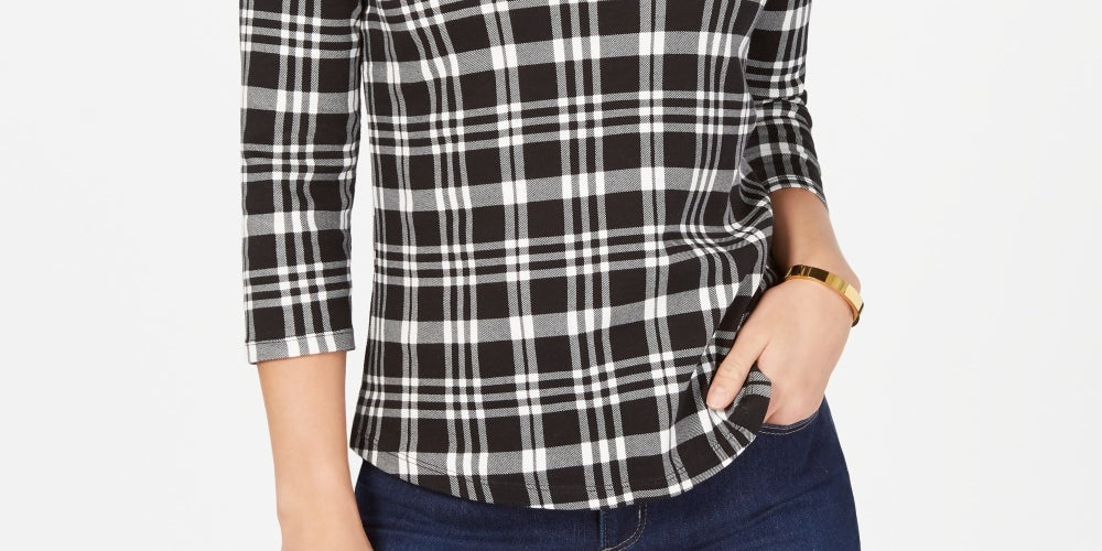Charter Club Women's Petite Pima Cotton Button-Shoulder Print Top Black Size PP