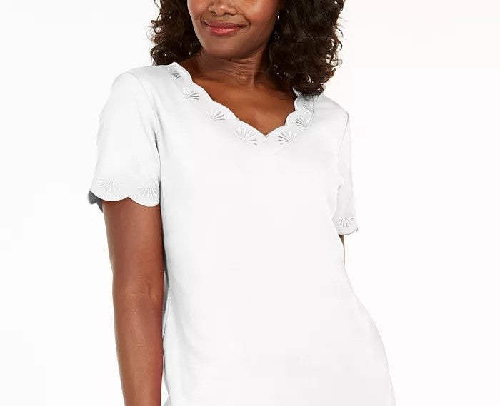 Karen Scott Women's Cotton Scalloped V-Neck T-Shirt White Size XX Large