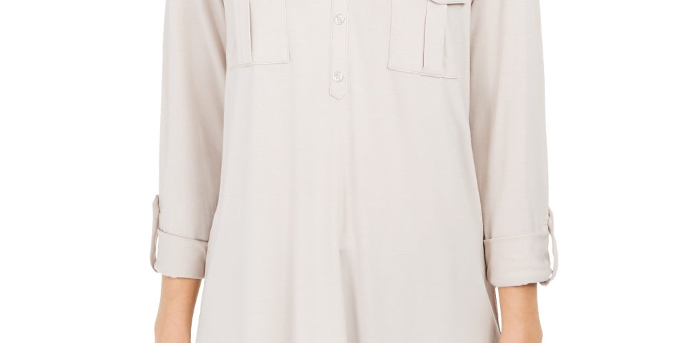 Petite Largeeated patch pockets with buttoned flaps at chest; shirttail hemline|Imported|Roll-tab 3/4-sleeves|SPetite Largeit rounded neckline with button-trimmed tab