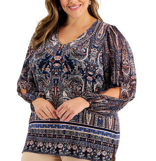 JM Collection Women's Paisley Print Split Sleeve Top Blue Size 3X