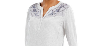 Style & Co Women's Velvet Yoke Embroidered Top Grey Size Petite Large