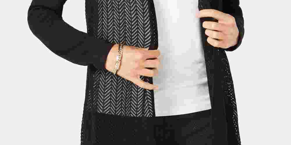 Relaxed fit; hits below hip; approx. 29 long|Collarless; open front|Chevron pointelle knit at front|Ramie/rayon