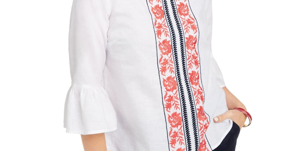 Charter Club Women's Embroidered Bell-Sleeve Linen-Blend Top White Size Large