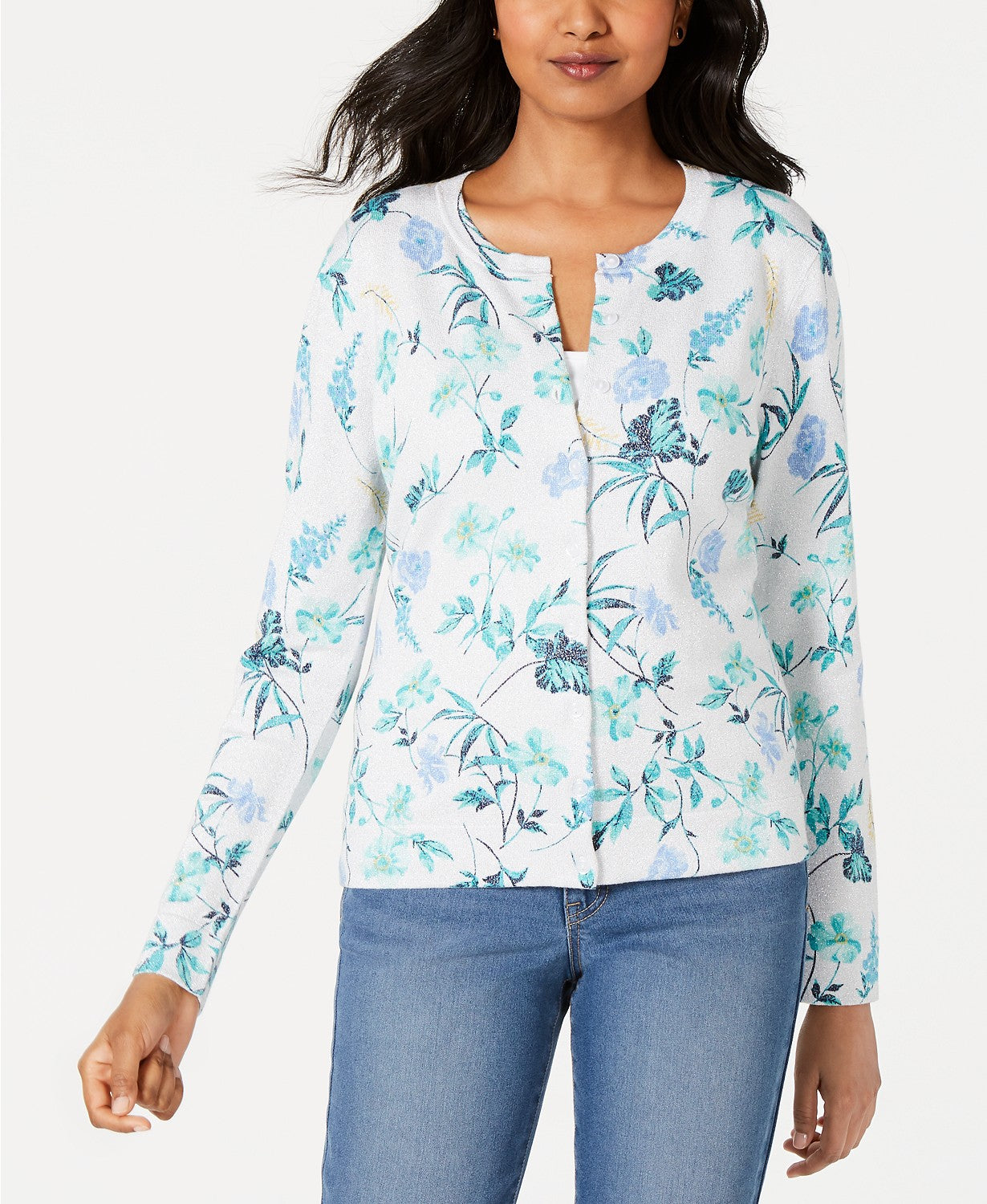 Approx. model measurements: height: 5'10"; bust: 35-1/2"; waist: 27"; hips: 35"|Hits at hip, approx. 23-1/2" long|Crewneck; buttoned closures|Rayon/nylon/metallic threading|Machine washable|Imported