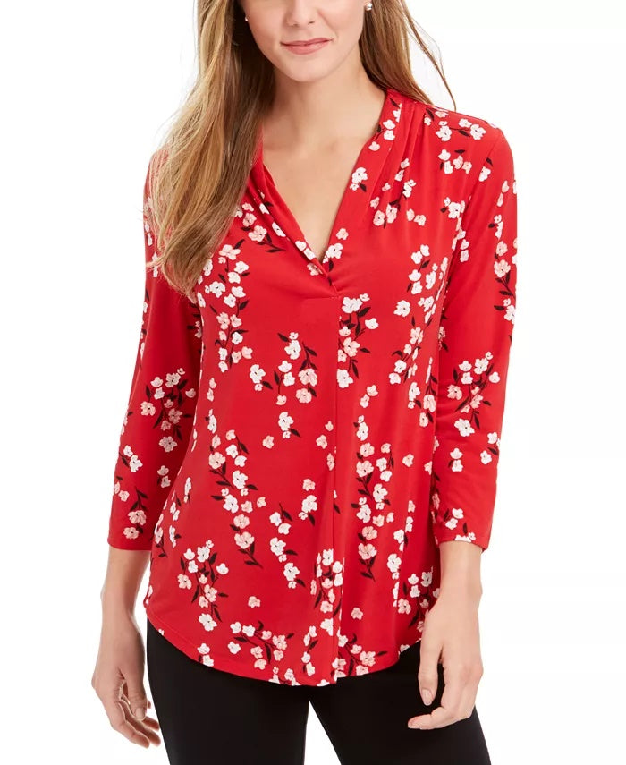 Relaxed fit; approx. 28" long|V-neck|3/4-sleeves|Polyester/spandex|Machine washable