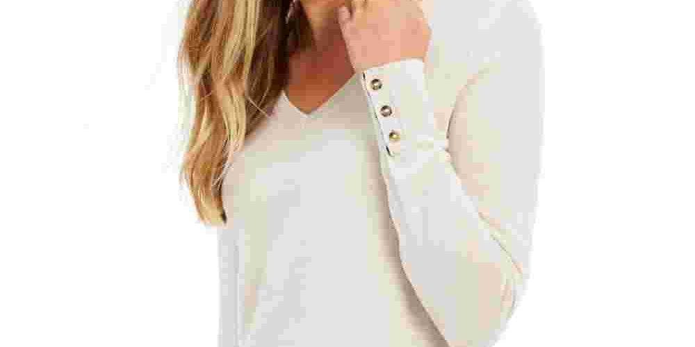 Charter Club Women's Heather Cuffed V Neck T-Shirt Top Beige Size X-Large