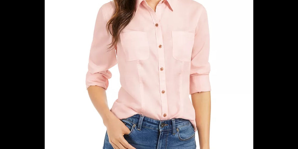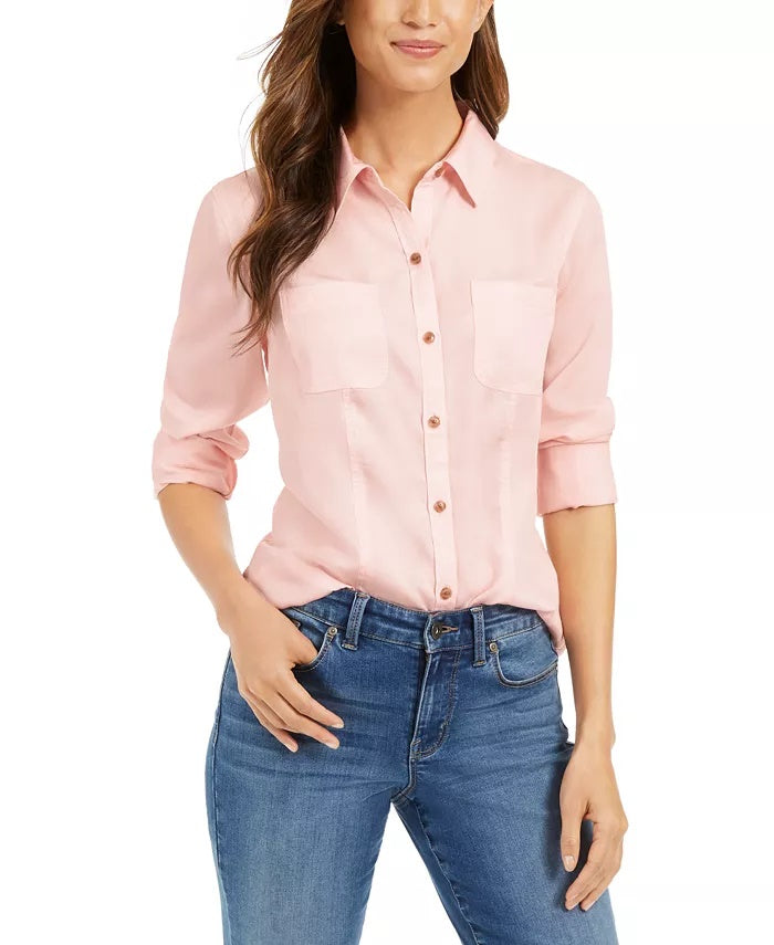 Designed to fit and flatter 5'4 and under frame|Point collar; front button closures|Patch pockets at chest|Roll-tab sleeves|Lyocell