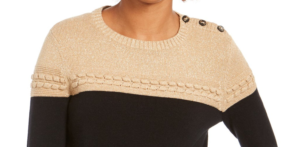 Fitted; approx. 24" long|Designed to fit and flatter 5'4" and under frame|Crewneck|Non-functional buttons on shoulder|Cotton/nylon/metallic|Machine washable