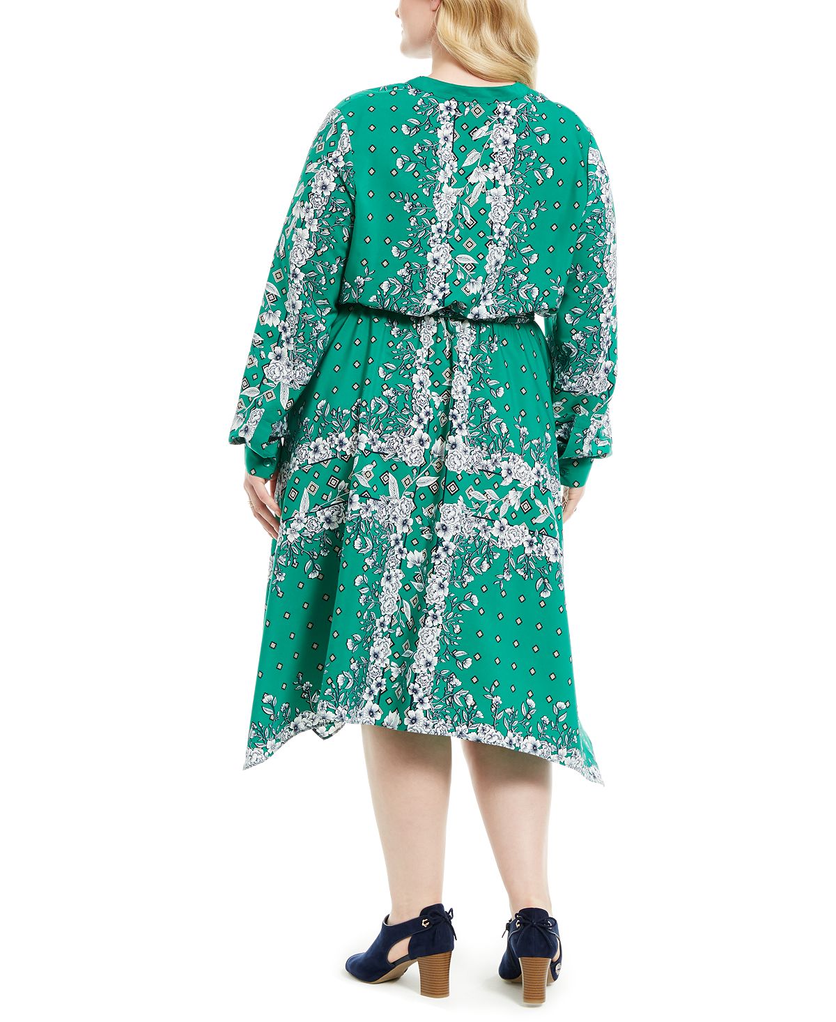 V-neck| Button placket at front| Self tie belt; handkerchief hemline