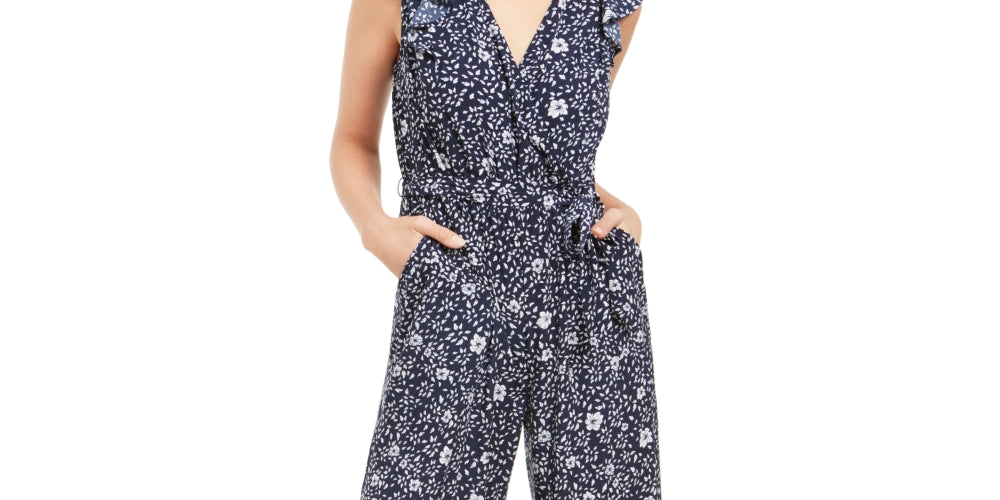 Approx. inseam; 25|Due to generous sizing; we suggest sizing down for the perfect fit|V-neck; pull-on style|Back keyhole and button; ruffled shoulders; elasticized waist; matching belt at waist|Pockets at hips