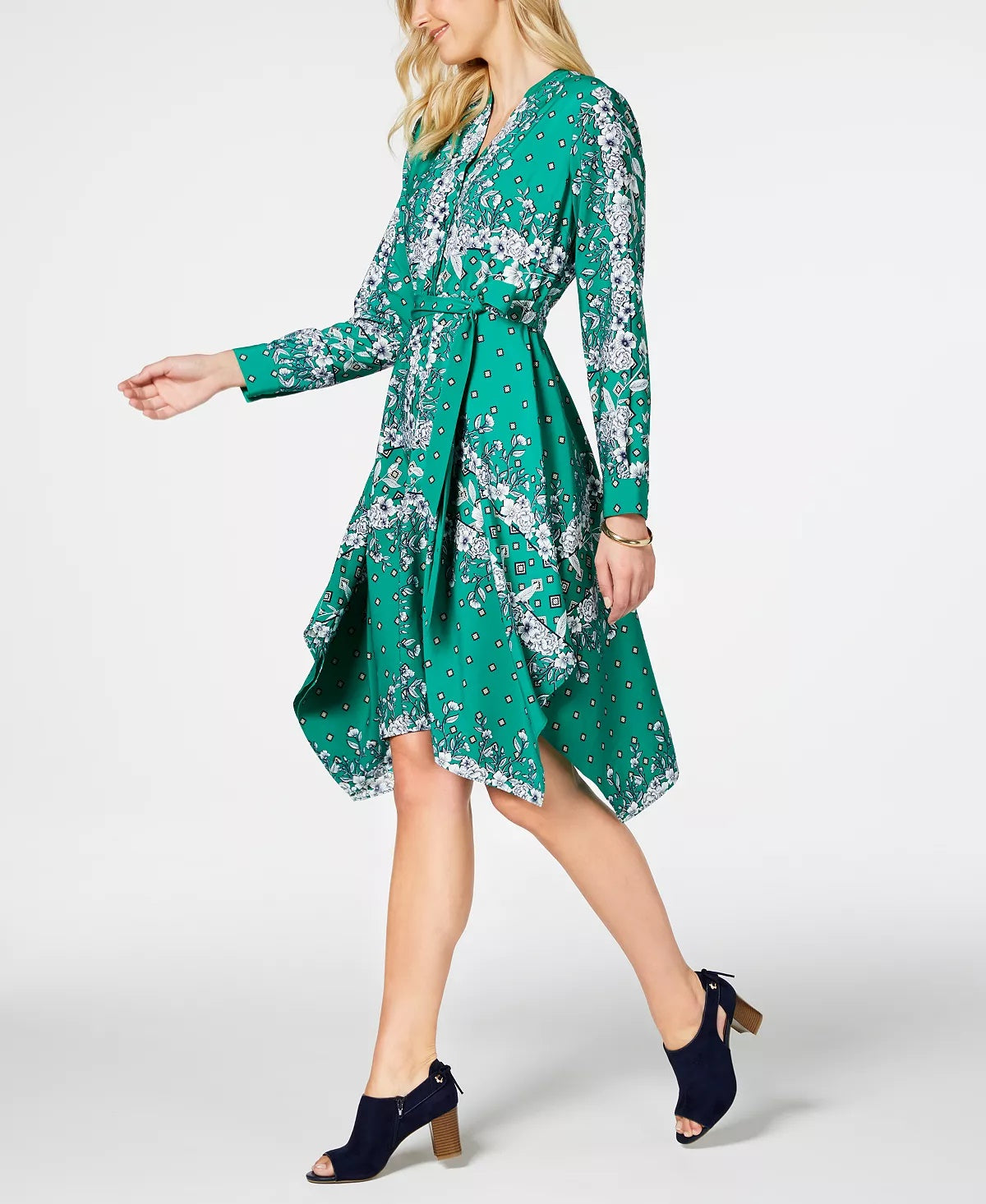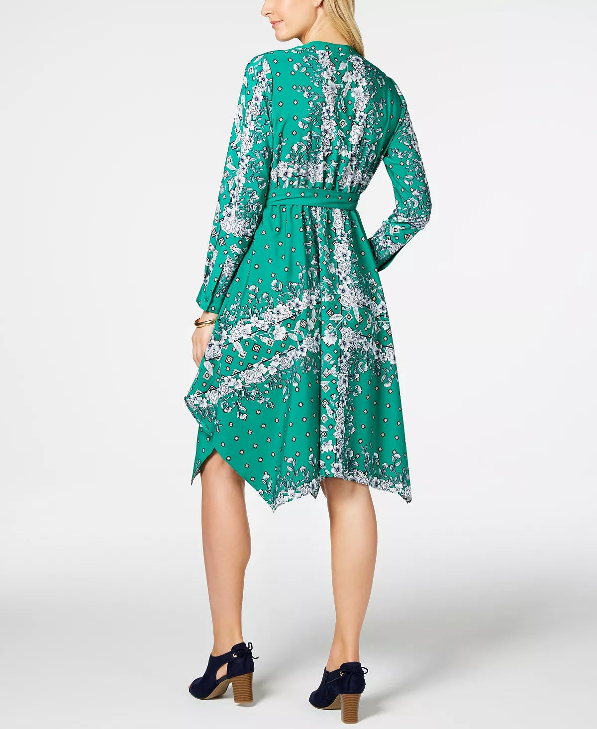 Charter Club Women's Printed Handkerchief Hem Shirtdress Green Size Petite L