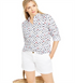 Charter Club Women's Printed Roll Tab Sleeve Linen Blend Top White Size Large
