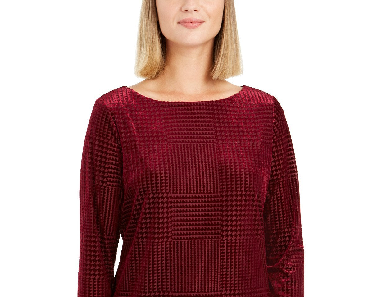 Textured velvet top|Approx. 26" long|Boat-neck|3/4-sleeves