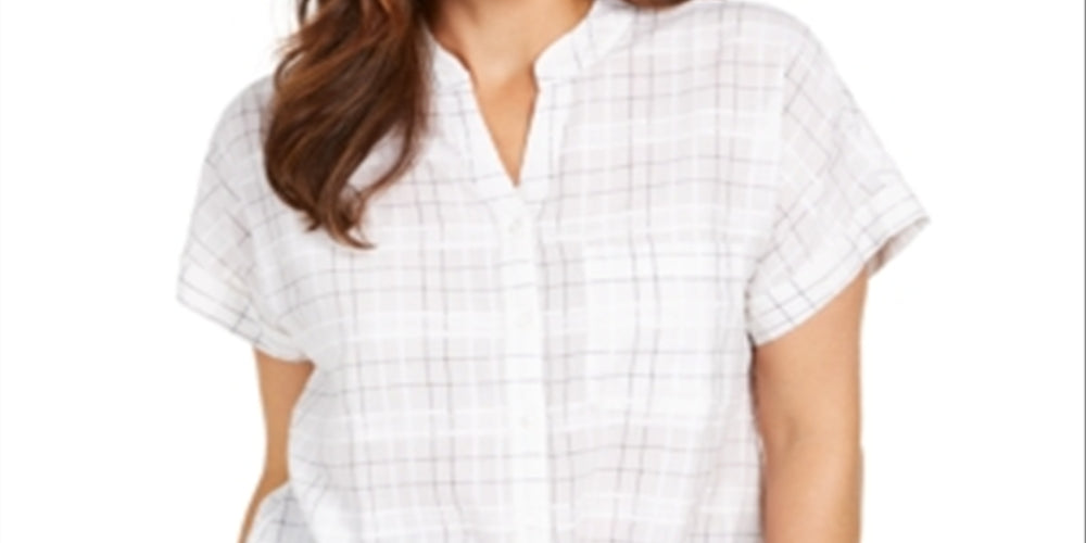 Charter Club Women s Windowpane-Print Tie-Waist Top (S Bright White Combo) Machine wash Short Sleeve Style; Blouse Size Type; Regular