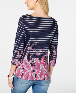 Charter Club Women's Striped Paisley Print Top Blue Size Large