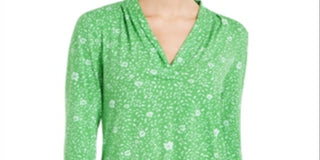 Charter Club Women's Floral Print Pleated V Neck 3/4 Sleeve Top Green Size Small