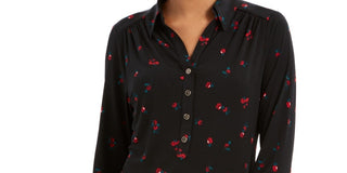 Charter Club Women's 3/4 Sleeve Printed Polo Top Black Size X-Small