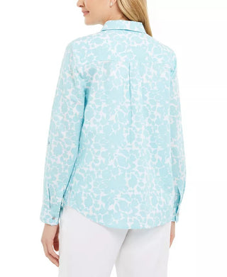 Charter Club Women's Floral-Print Linen-Blend Shirt Blue Size Small