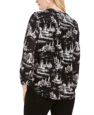 Charter Club Women's Printed Split-Neck Top Black Size X-Small