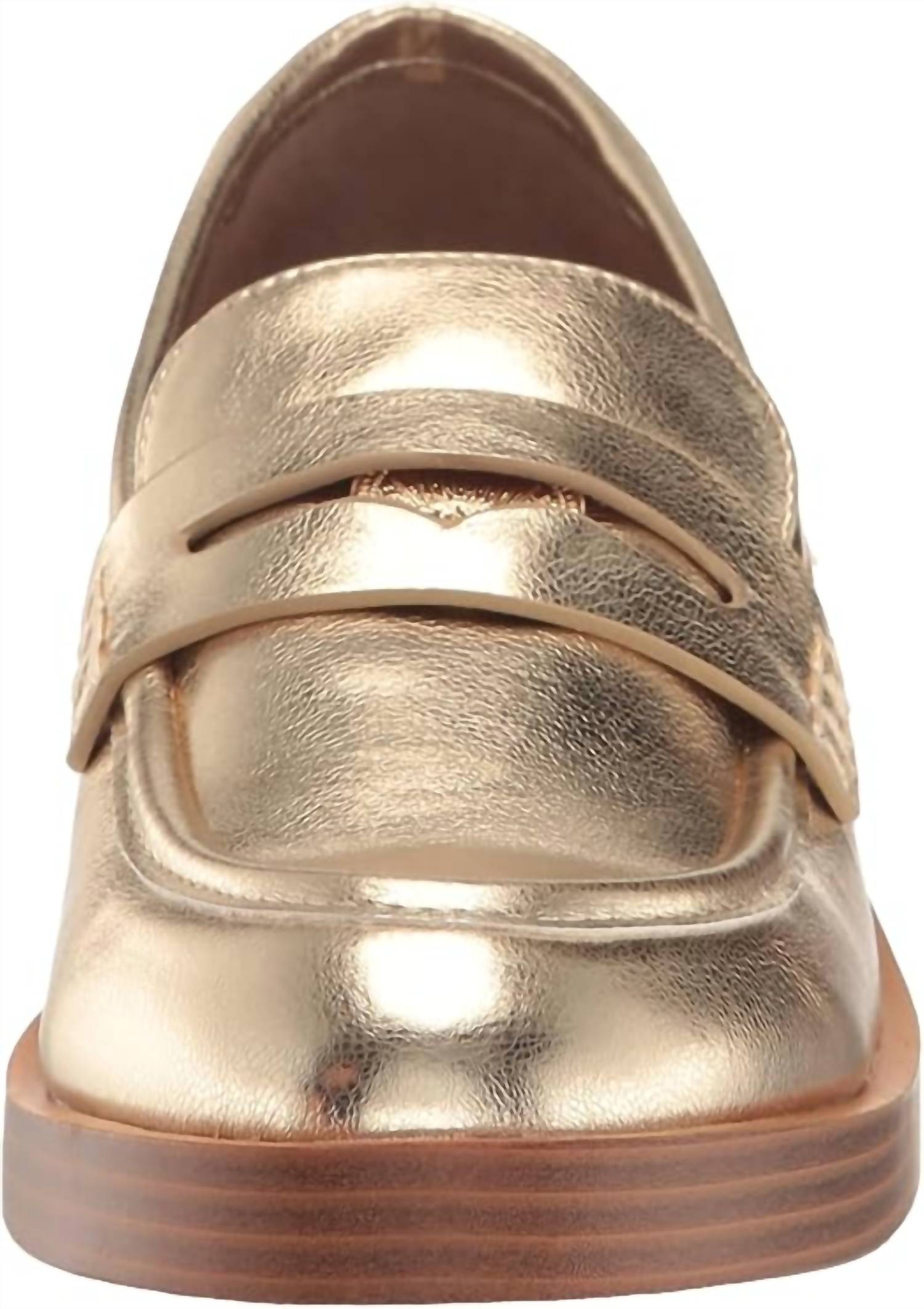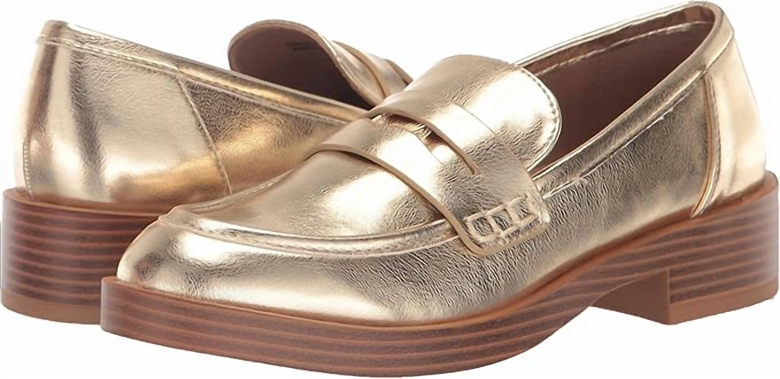 A classic loafer that is both comfortable and polished. The Chinese Laundry Porter Loafer in gold is the epitome of chic elegance for women. Designed with an almond toe shape, this loafer seamlessly combines comfort and style, making it perfect for any occasion. Country of Origin: Not specified. Pair these loafers with your favorite ensemble for a polished finish.