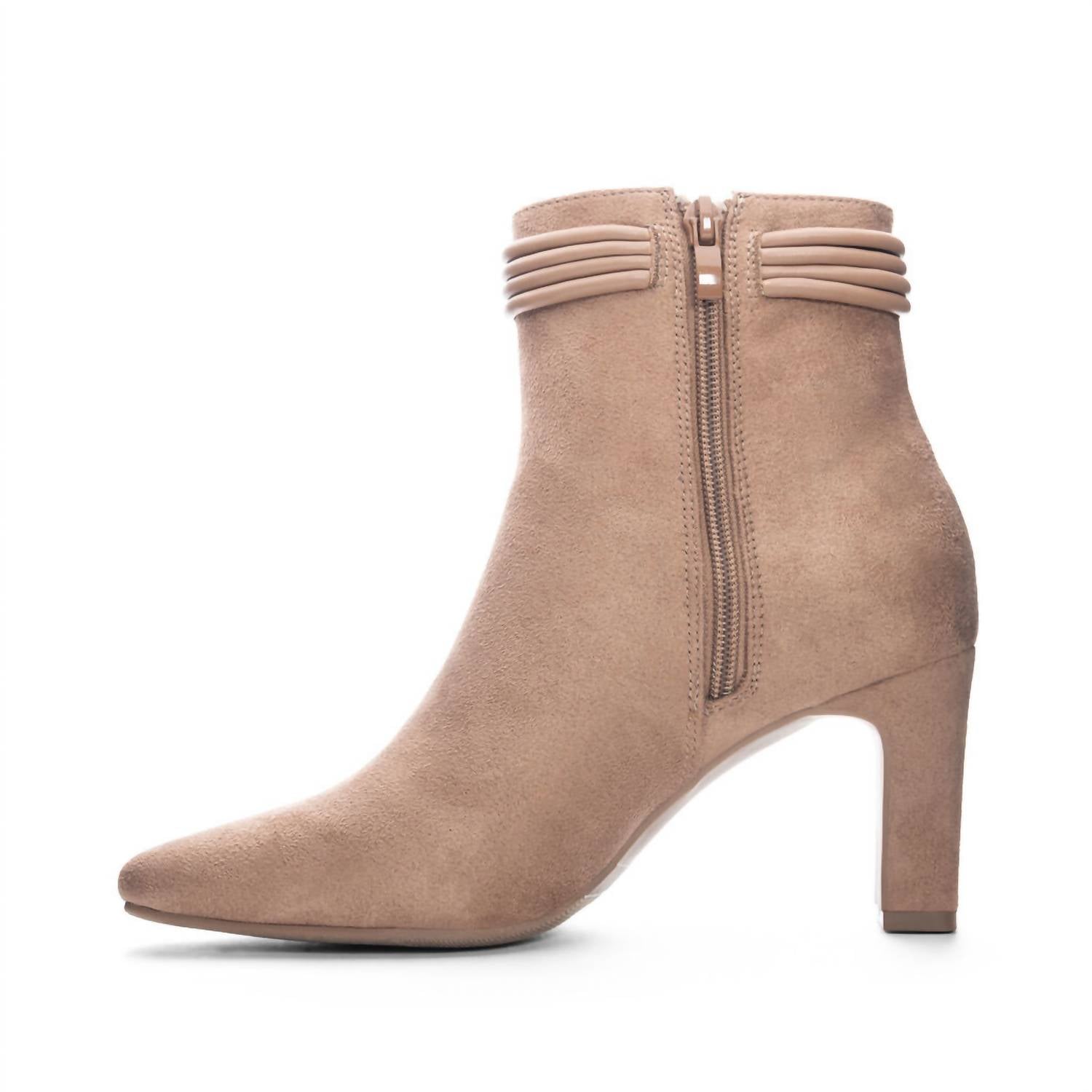 Say hello to the perfect, most versatile boot. The ankle height makes this style easily transition from day to night. Wear them with your favorite skinny jeans and tee for a more laid back look, or pair them with your favorite mini dress and jacket for a night out on the town. Upgrade your wardrobe with the Never Ending Suede Bootie from CHINESE LAUNDRY, available in a elegant shade of brown taupe. Constructed from manmade materials and genuine leather suede, these ankle booties offer a sleek pointed toe design. The stiletto heel stands at a striking 3 inches, adding a touch of sophistication to any outfit. Featuring a convenient inside zipper closure, these booties are perfect for women seeking both style and practicality.