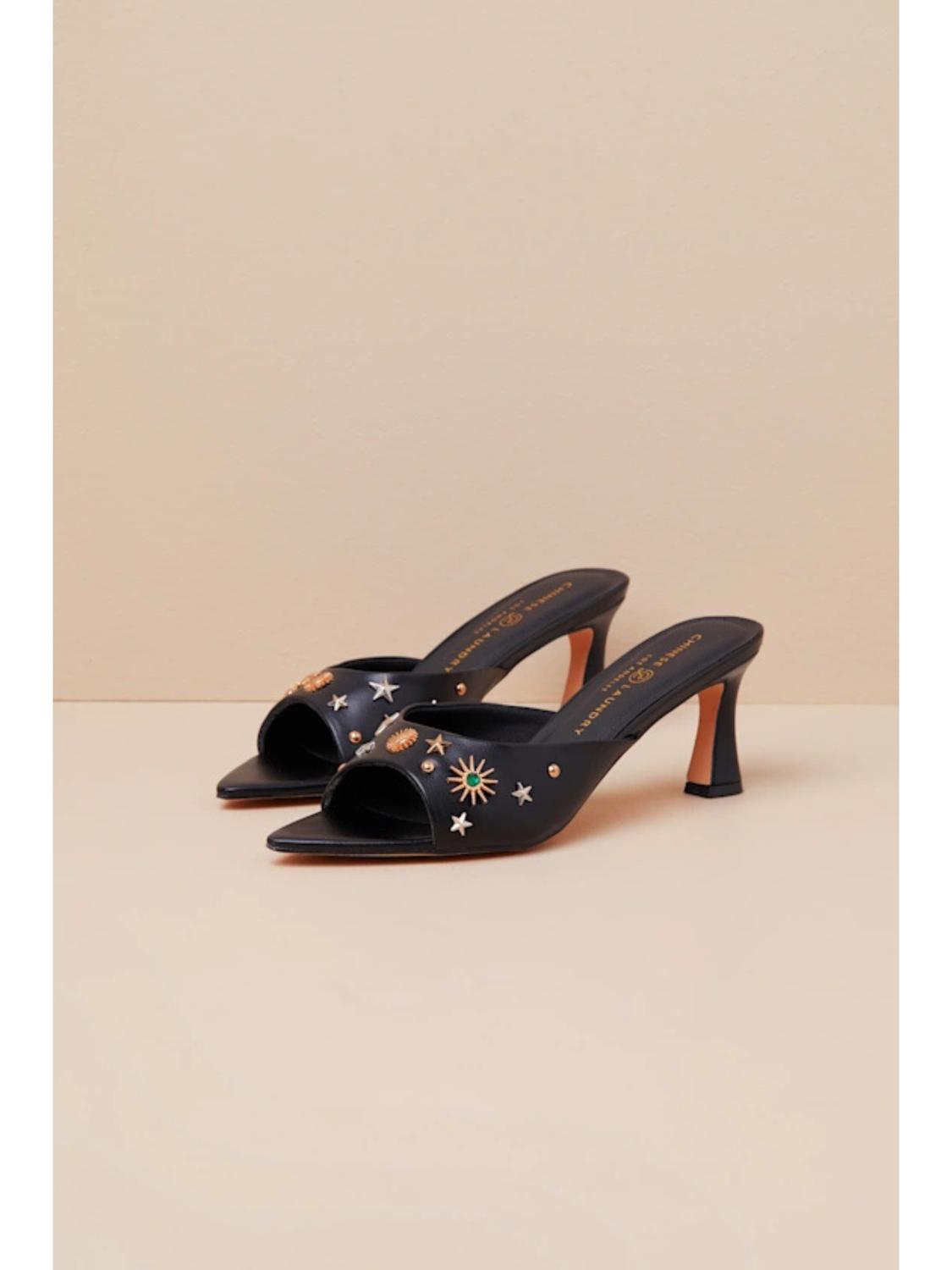 Add a star-studded sparkle to your look with the Yarah Embellished Mules by CHINESE LAUNDRY. These black open-toe mules feature eye-catching star-shaped studs and a chic sculpted spool heel measuring 2.75 inches. Designed with a gently cushioned insole, they offer both comfort and style for any special occasion. Perfect for events like anniversaries or Mother's Day, these mules ensure you step out in style.