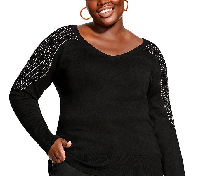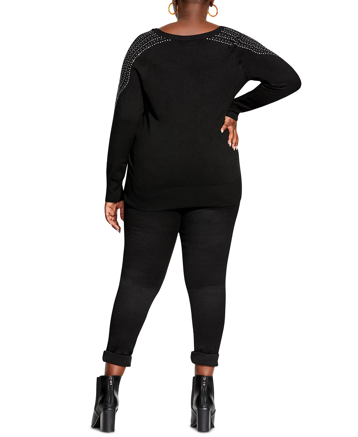 Approx. length: 26-2/5"; relaxed fit|V-neck|Silver bling shoulder detailing; stretch fine rib fabrication|Please note that this item has International Sizing. Please see US Sizing Conversions noted here that will appear on the merchandise tag when received: 14W= XS, 16W = S, 18W = M, 20W= L, 22W, = XL, 24W = XXL.|Unlined|ABOUT THE BRAND: