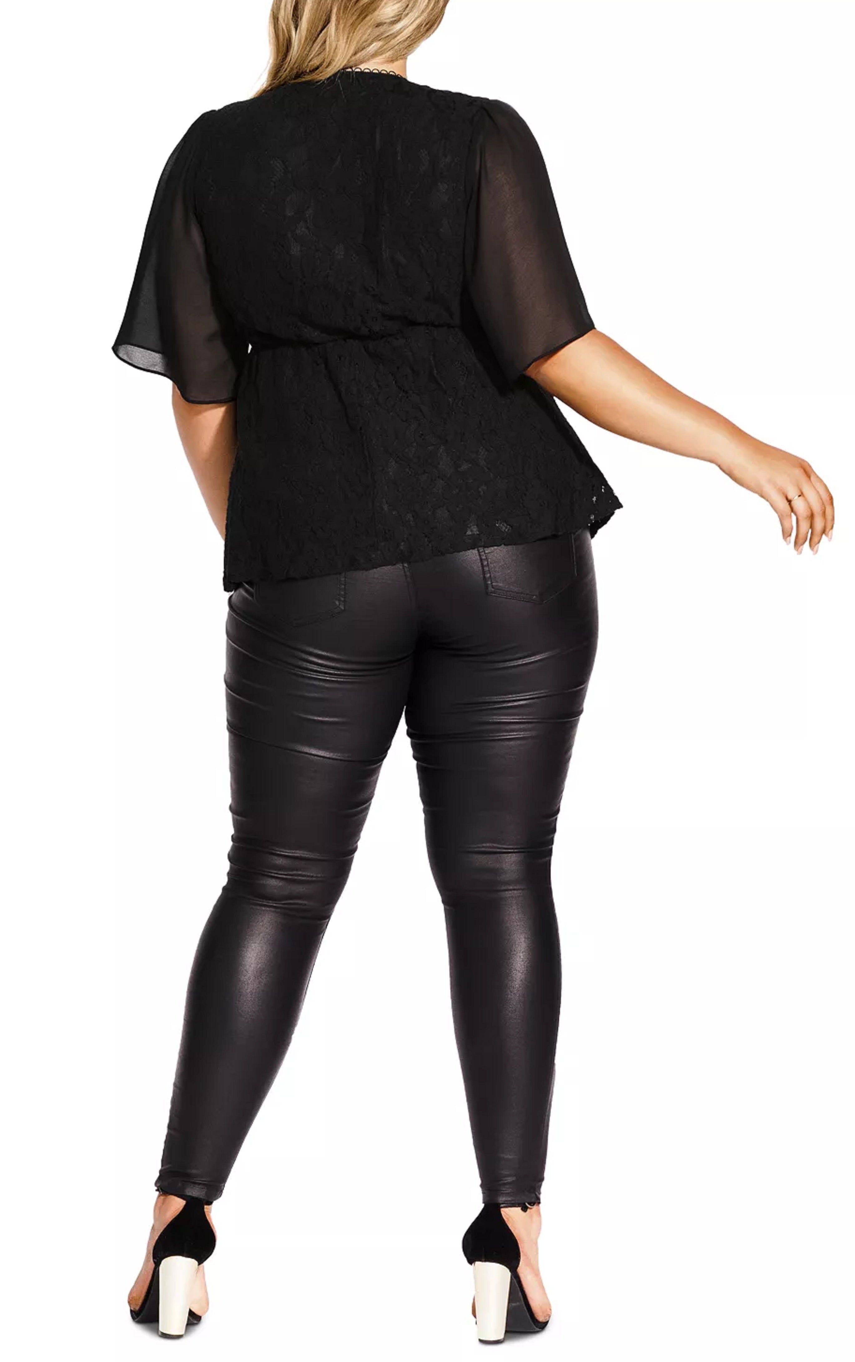 Approx. 28-1/5 long; relaxed fit|Deep V-neck|Stretch lace and mesh; elastic waist at back|Sheer bell sleeves|Please note that this item has International Sizing. Please see US Sizing Conversions noted here that will appear on the merchandise tag when received; 14W= XS; 16W = S; 18W = M; 20W= L; 22W; = XL; 24W = XXL.