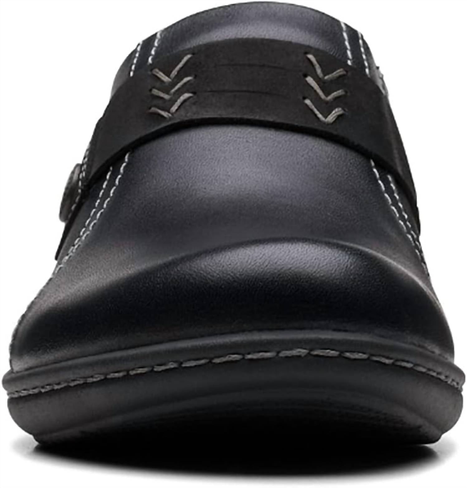 Step into minimalistic comfort with the Women's Laurieann Ella Clogs by Clarks, expertly crafted for the fashion-savvy individual. These easy-to-wear slides feature a responsibly sourced black leather upper and an adjustable closure for a secure fit. Enjoy all-day comfort with the Ultimate Comfort PU foam footbed and experience enhanced flexibility and traction with the lightweight EVA outsole. Composition: 100% Leather. Closure: Pull-On. Perfect for embracing 90s fashion this Spring.