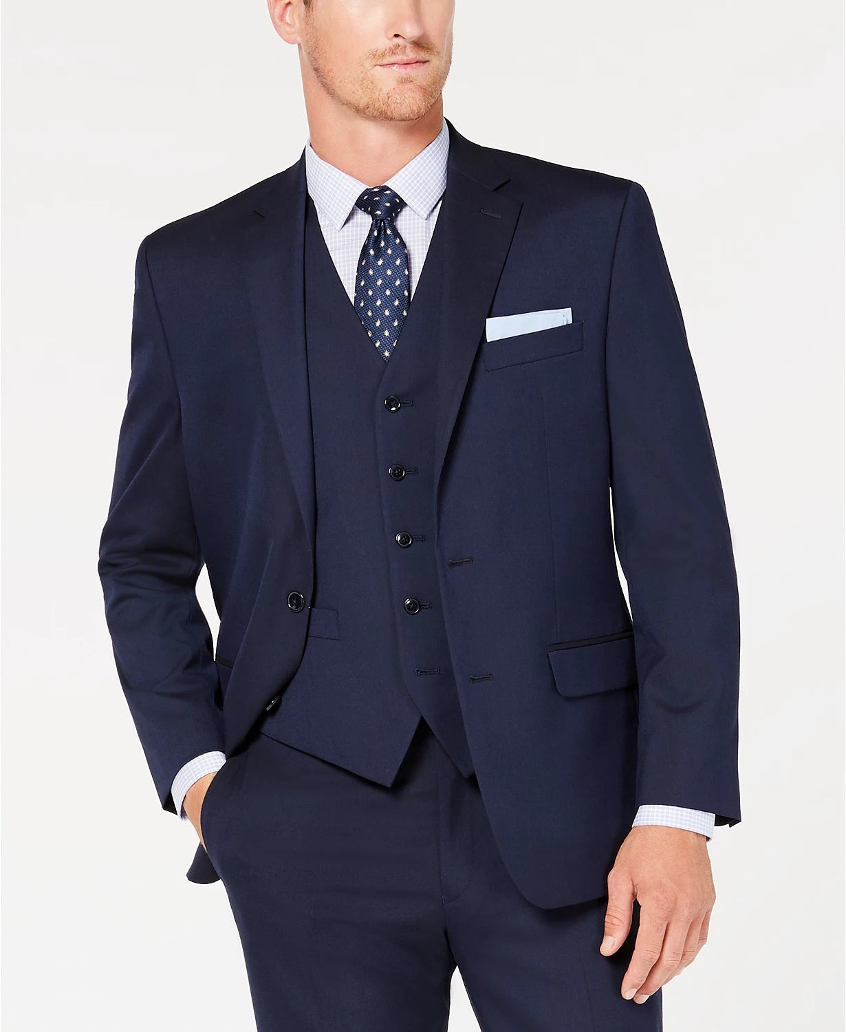 Regular fit through the shoulders, chest and waist with standard armholes and sleeves; Classic fit pants sit at the waist; relaxed fit through hips and thighs with a straight leg opening|Suit includes fully lined jacket, fully lined vest and flat front, unlined pants with finished hem|Height recommendation: Short (S) = 5'7" and under; Regular (R) = 5'8"-5'11"; Long (L) = 6' and over|This suit has a 6" drop which is the difference between the size of jacket & pants. For example: a 40R jacket includes a 34W pant|Click on our size chart above for more sizes and details|The Vested Suit featured on The It List