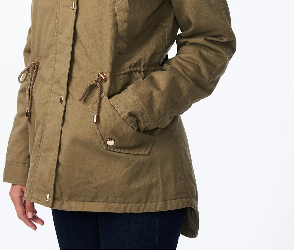 Attached hood; front zipper closure with button overlay|Drawstring waist|Imported|Two pockets at chest; two snap flap pockets at hip|Web ID: 11096296