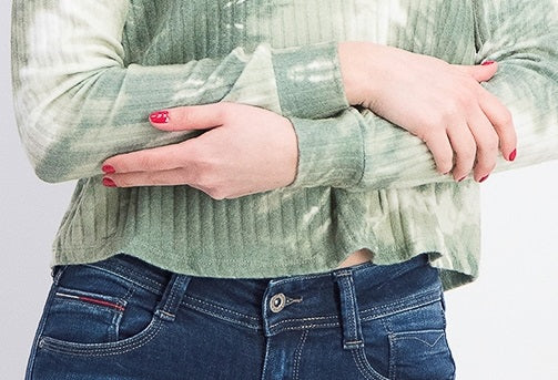 V-neck|Tie-dyed; ribbed throughout|Runs small, we suggest sizing up for the perfect fit|Polyester/rayon/spandex|Machine washable|Imported