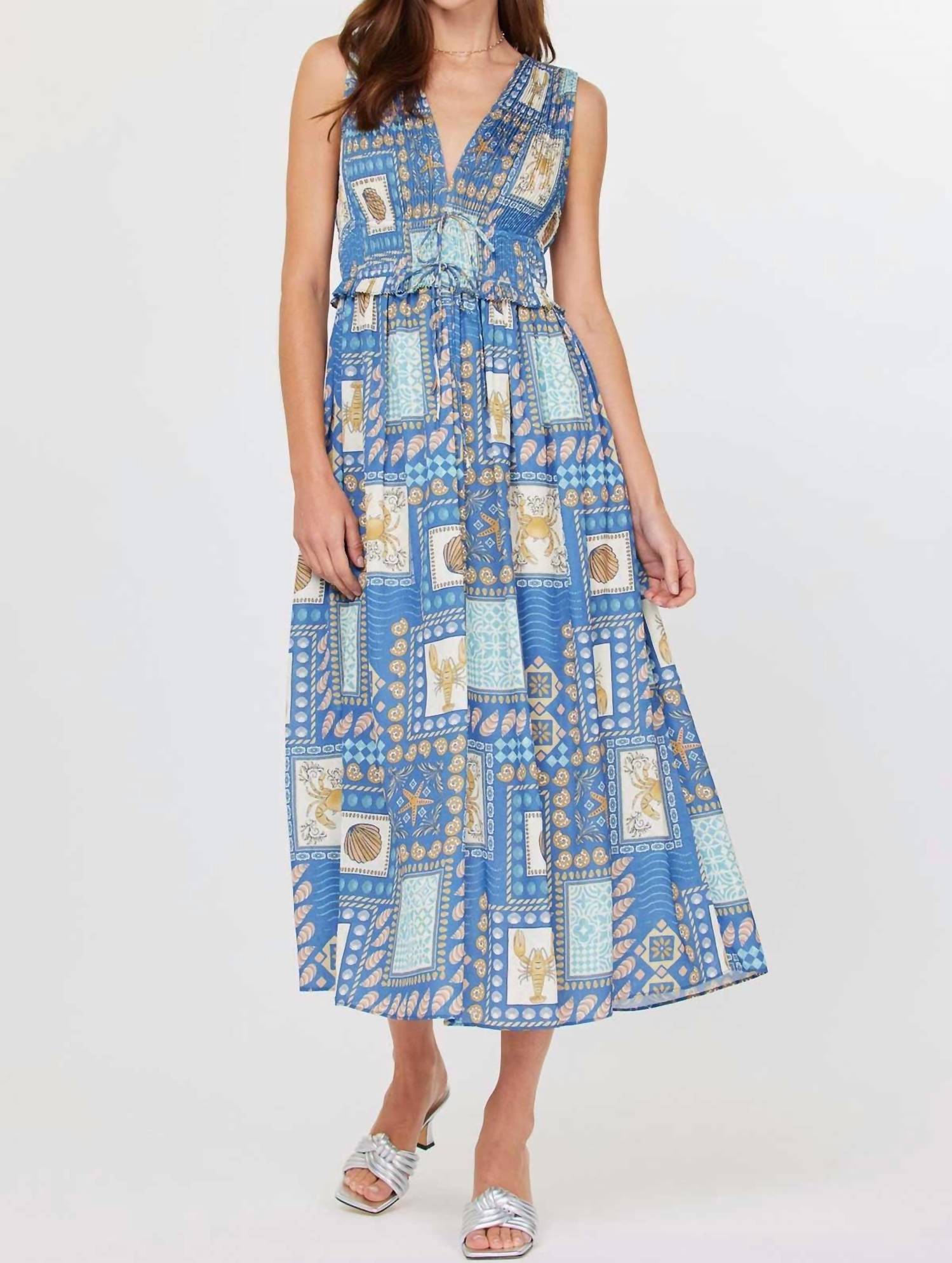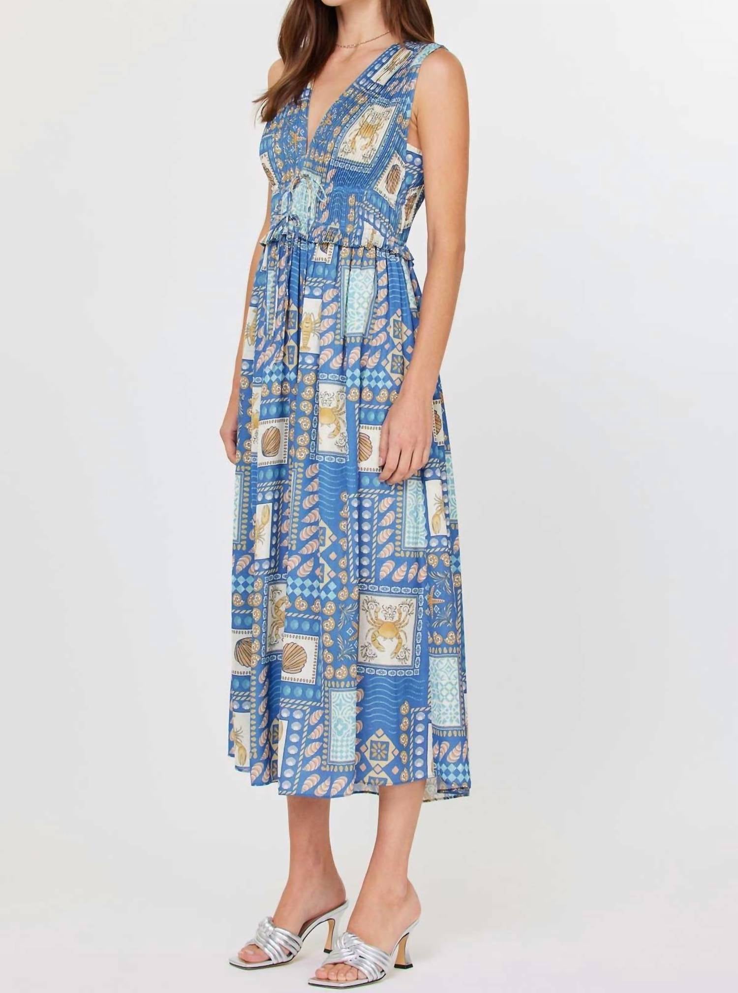 Casual, comfortable and cute! The dress that you'll be reaching for all season long. Embrace coastal elegance with the Kataleya Midi Dress by Current Air, a stunning piece in a sea blue hue adorned with an exclusive tile print pattern. This sleeveless, V-neck dress offers a flowing, pleated A-line silhouette perfect for summer outings. Made in the USA from 100% polyester, it features a pull-on closure for easy wear. For optimal care, simply hand wash this dress to maintain its vibrant appeal.