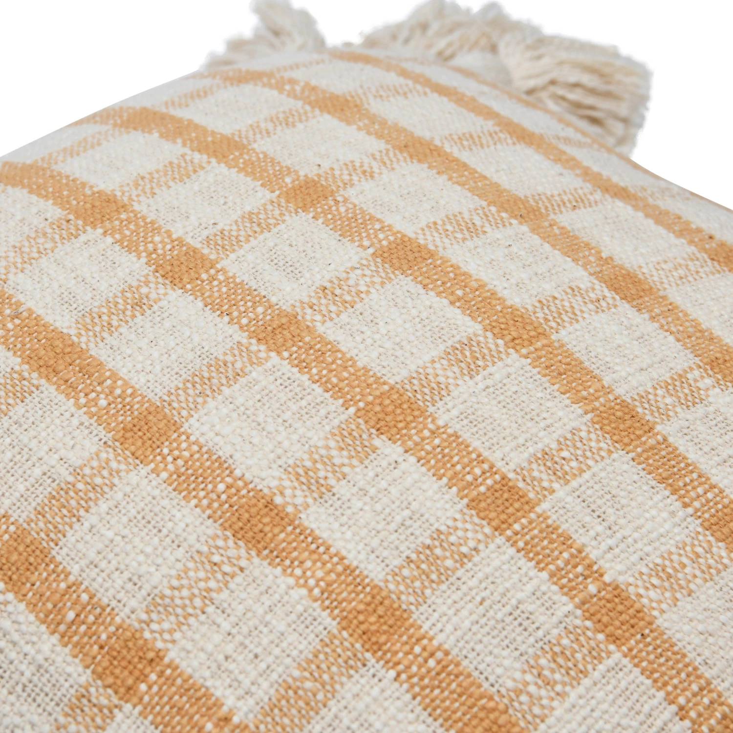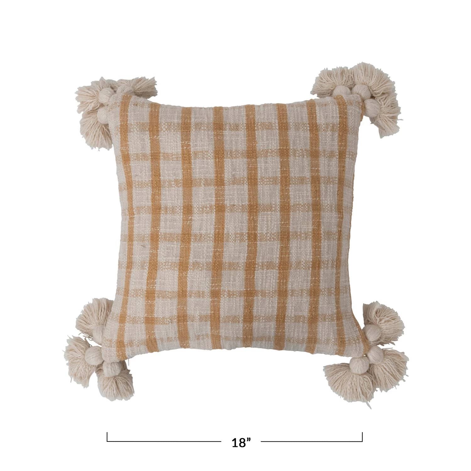 Introducing the Square Woven Cotton Slub Plaid Pillow with Tassels by Creative Co-op, designed to amplify your decor with its playful charm. Crafted from soft cotton with a classic mustard and cream plaid print, this 18" x 18" square pillow is adorned with decorative tassels for an eye-catching detail. The pillow features a removable cotton cover and insert, ensuring easy maintenance. Care for this stylish accent by machine washing on a cold, gentle cycle and tumble drying on low.