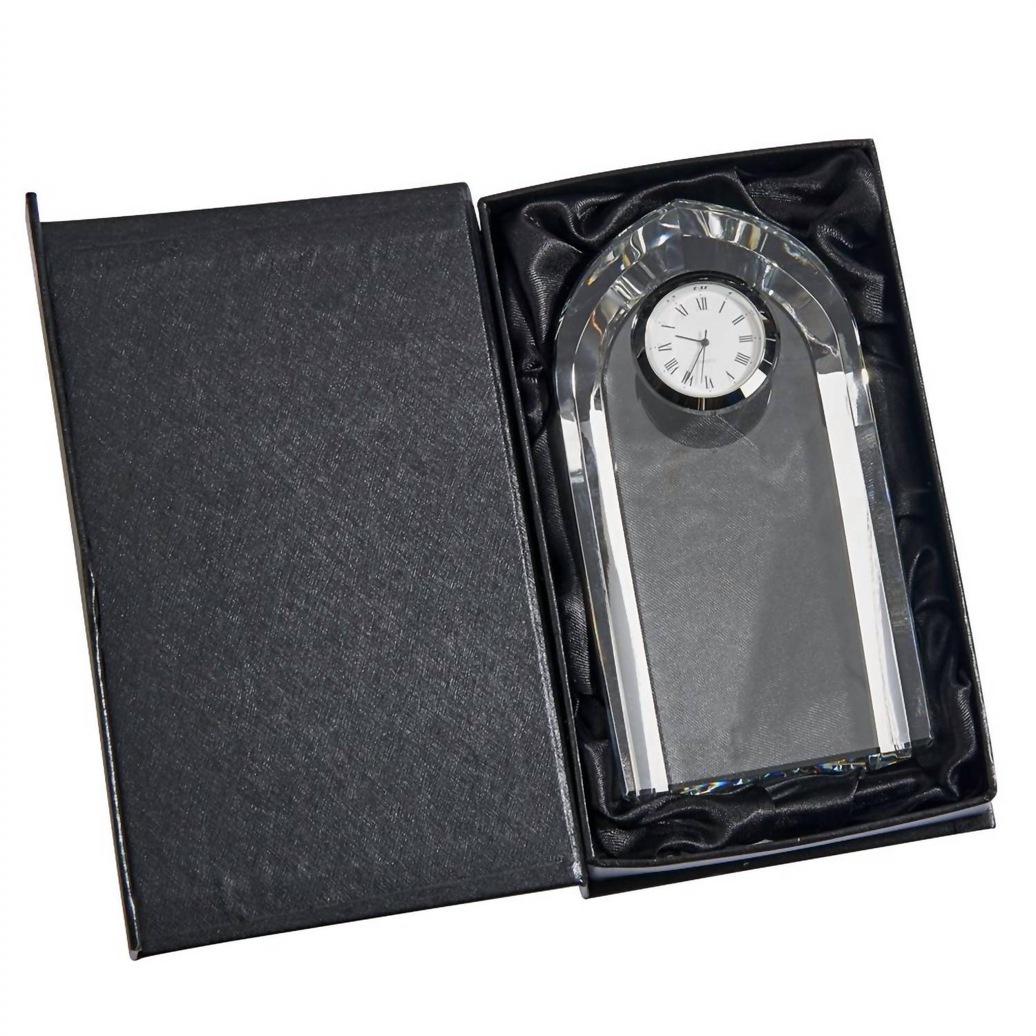 This Optic Crystal Arched Clock stands 6" tall by 3.25" wide. The optic crystal is clear and heavy but contains no lead so it can be etched by laser engraving. The chrome bezel surrounds a 1.5" diameter white faced clock that features black hands and Roman numerals. The 3.5" by 3.25" area under the clock can be used for personalization or engraving a custom message Battery powered for ease of use. (Watch size battery - included). Gift Boxed.