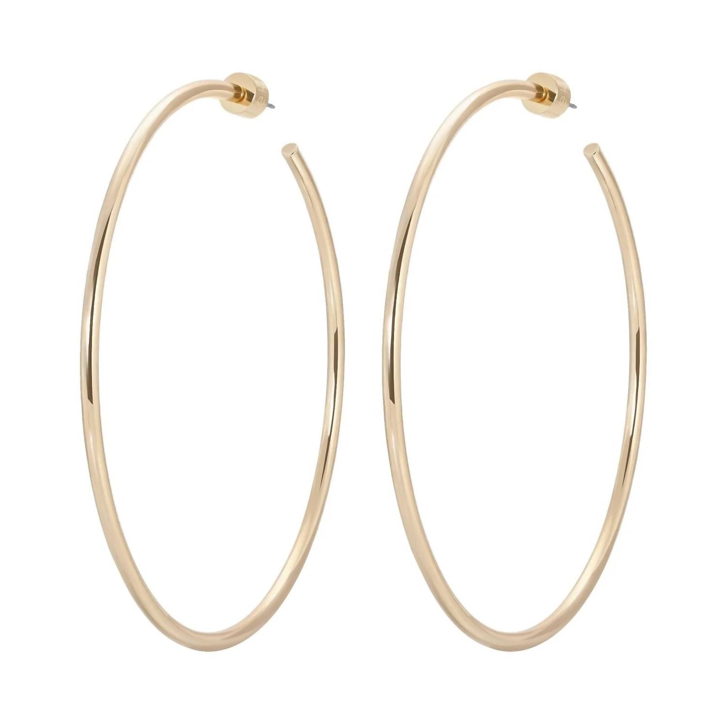 Easy and elegant earrings to complement any outfit. Presenting the Eklexic Women's 3" Ultimate Hoops, where elegance meets sustainability in fine jewelry. These gold hoops boast a bold 3-inch diameter and are crafted from .100" thick recycled brass wire, offering a lightweight yet substantial feel. Choose from an opulent 14K Yellow Gold finish that suits any style, and enjoy hypoallergenic comfort for sensitive skin. Closure: Push back. Ideal for those seeking eco-conscious craftsmanship without compromising on luxury.