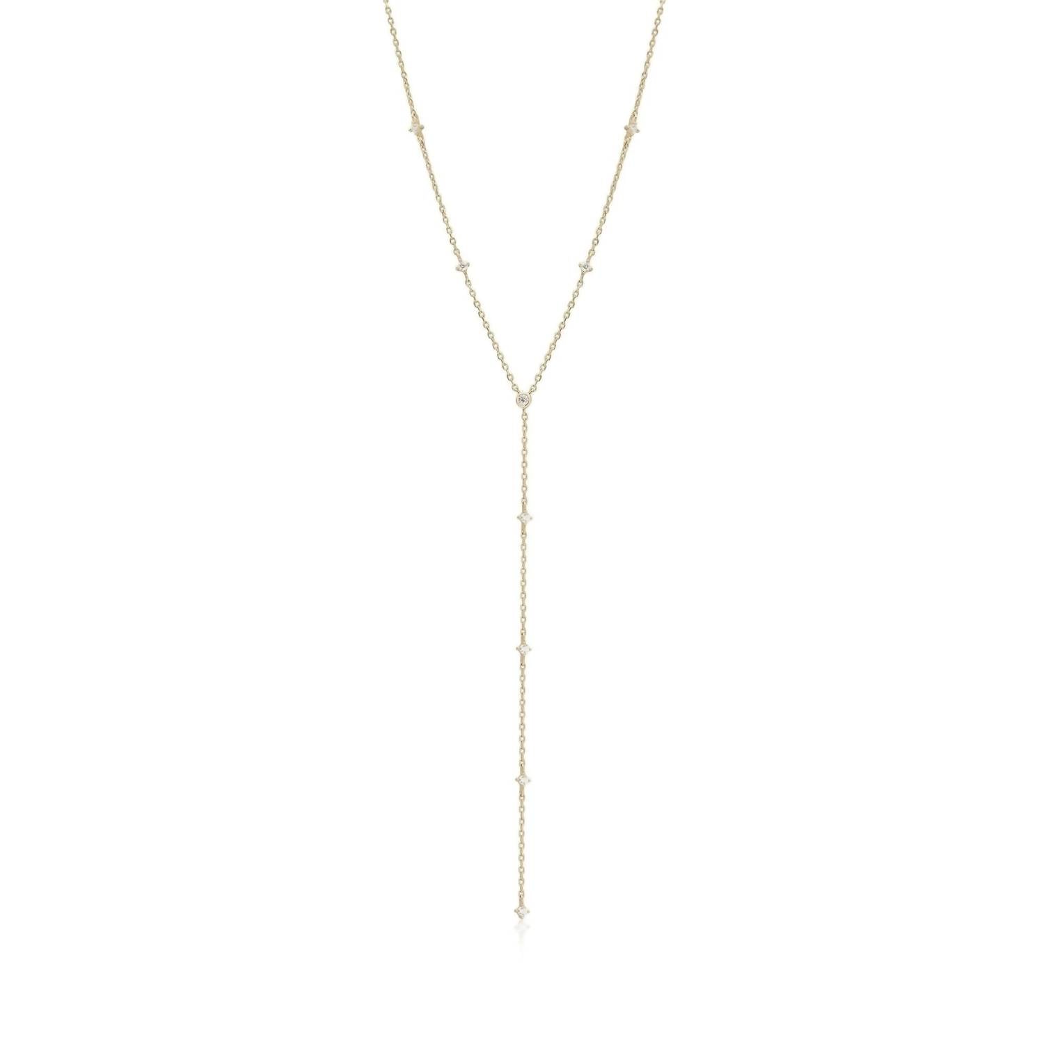 Layer this necklace or wear it on its own. Either way it's a win-win. Experience the allure of Eklexic's Women's CZ Studded Lariat Necklace, crafted from sustainable recycled 925 sterling silver. This elegant piece is available in 14K gold plated with E-coating or 14K gold vermeil, featuring a lariat design with a dramatic 3.5" drop. The necklace measures 16" with a 4" extender, offering adjustable lengths of 16”, 18”, or 20”. Highlighted by a center bezel setting with 2mm cubic zirconia and complemented by 1.75mm stones in prong settings, it brings a brilliant sparkle to any ensemble.