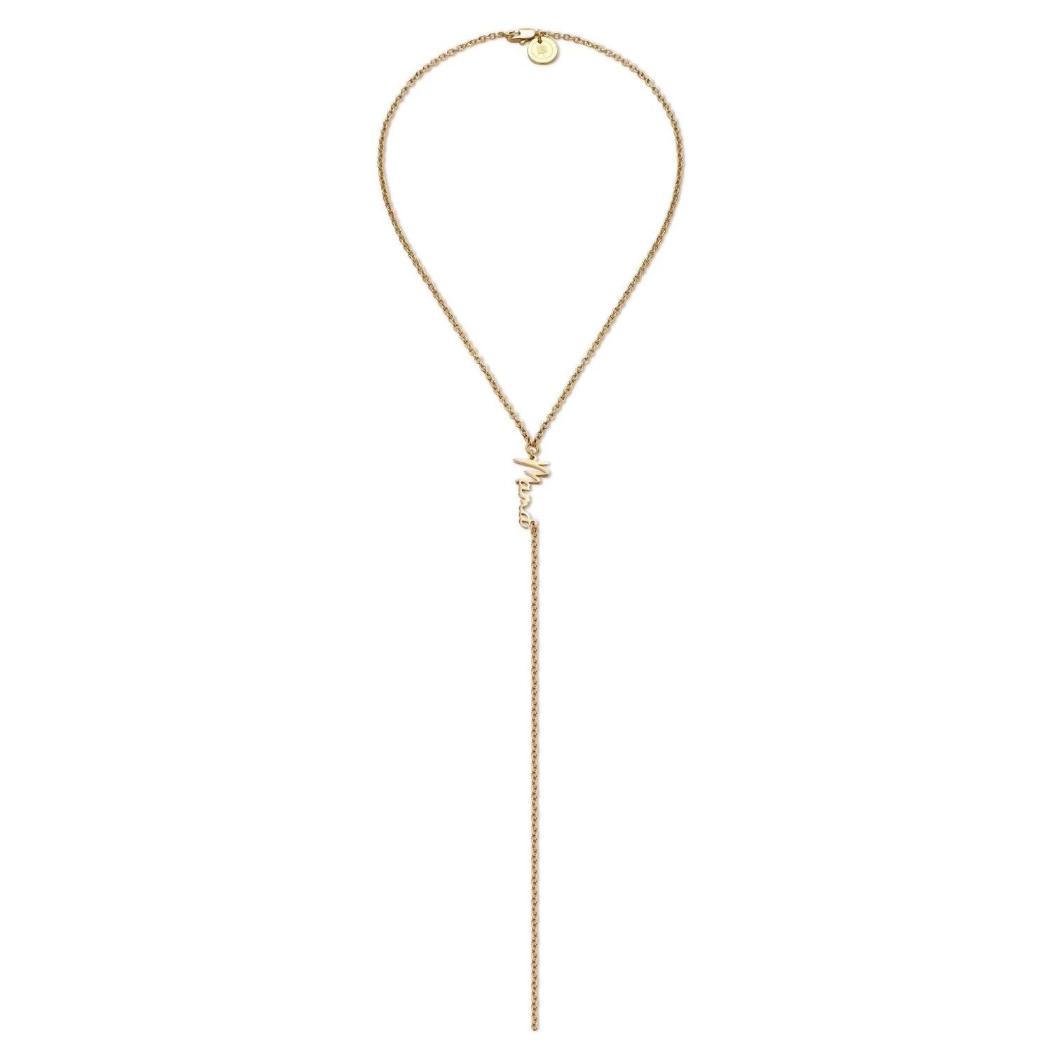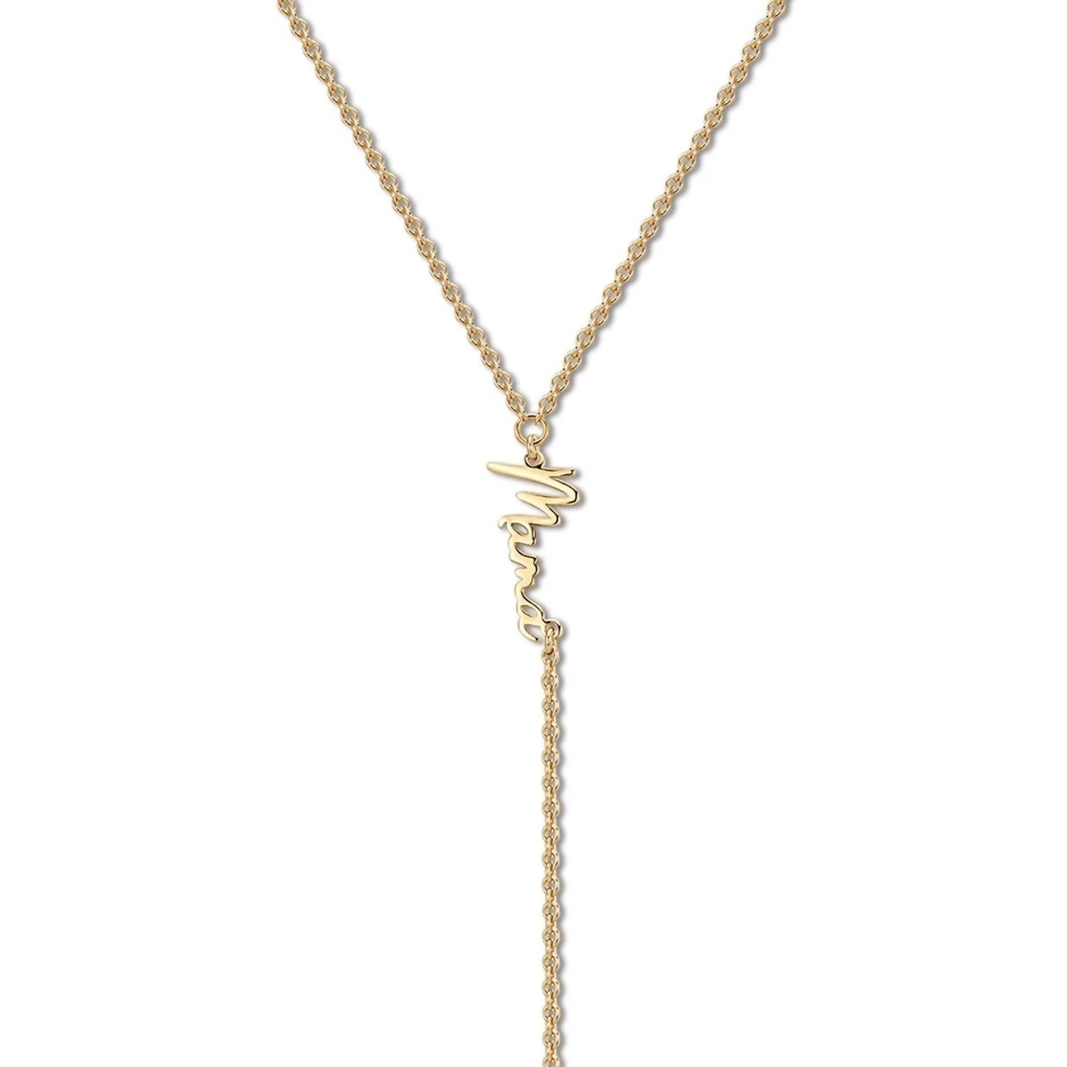 Layer this necklace or wear it on its own. Either way it's a win-win. Introducing the Women's Dainty Script Mama Lariat Necklace by Eklexic, a stunning piece that elevates any outfit with its fine craftsmanship. Crafted from recycled brass with your choice of 14K Gold or Rhodium plating, this necklace is designed to resist wear and maintain its elegant shine. The Script Mama pendant measures 11.5mm in height and 18mm in width, complemented by an 18" chain and an additional 6" drop for a graceful silhouette. Handmade in the USA, this necklace combines style with sustainability, making it a versatile addition to your jewelry collection.