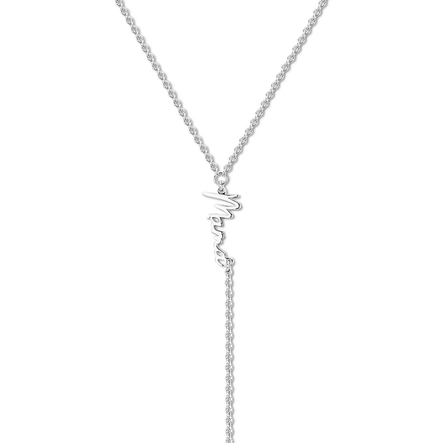 The perfect stand-out necklace that complements even the most basic t-shirt. Introducing the Women's Dainty Script Mama Lariat Necklace by Eklexic, a fine jewelry piece crafted with elegance and sophistication. Made from recycled brass and adorned with silver plating, this necklace features a beautifully crafted Script Mama pendant measuring 11.5mm with a width of 18mm. It offers an 18" chain around the neck with an additional 6" drop, creating an elongated and graceful silhouette. Expertly handmade in the USA, it reflects a commitment to both style and sustainability.