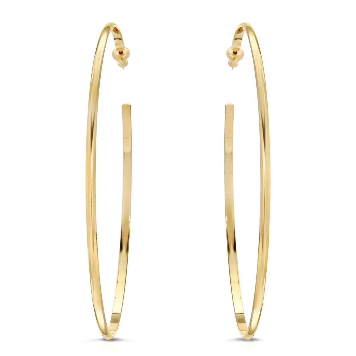 eye-catching earrings for every occasion. Discover the Women's Hannah Hoops by Eklexic, expertly crafted to offer both elegance and sustainability. Boasting a striking domed design, these fine earrings are made from premium recycled brass and finished in warm 14K Yellow Gold. With an impressive 3" diameter, .110" width, and .050" thickness, they make a bold statement. Add a touch of eco-friendly glamour to any outfit with Hannah Hoops.