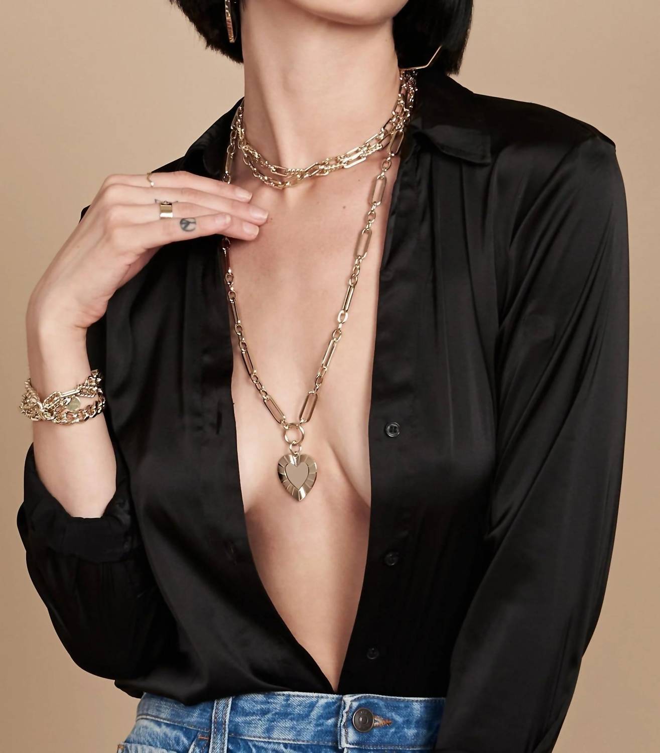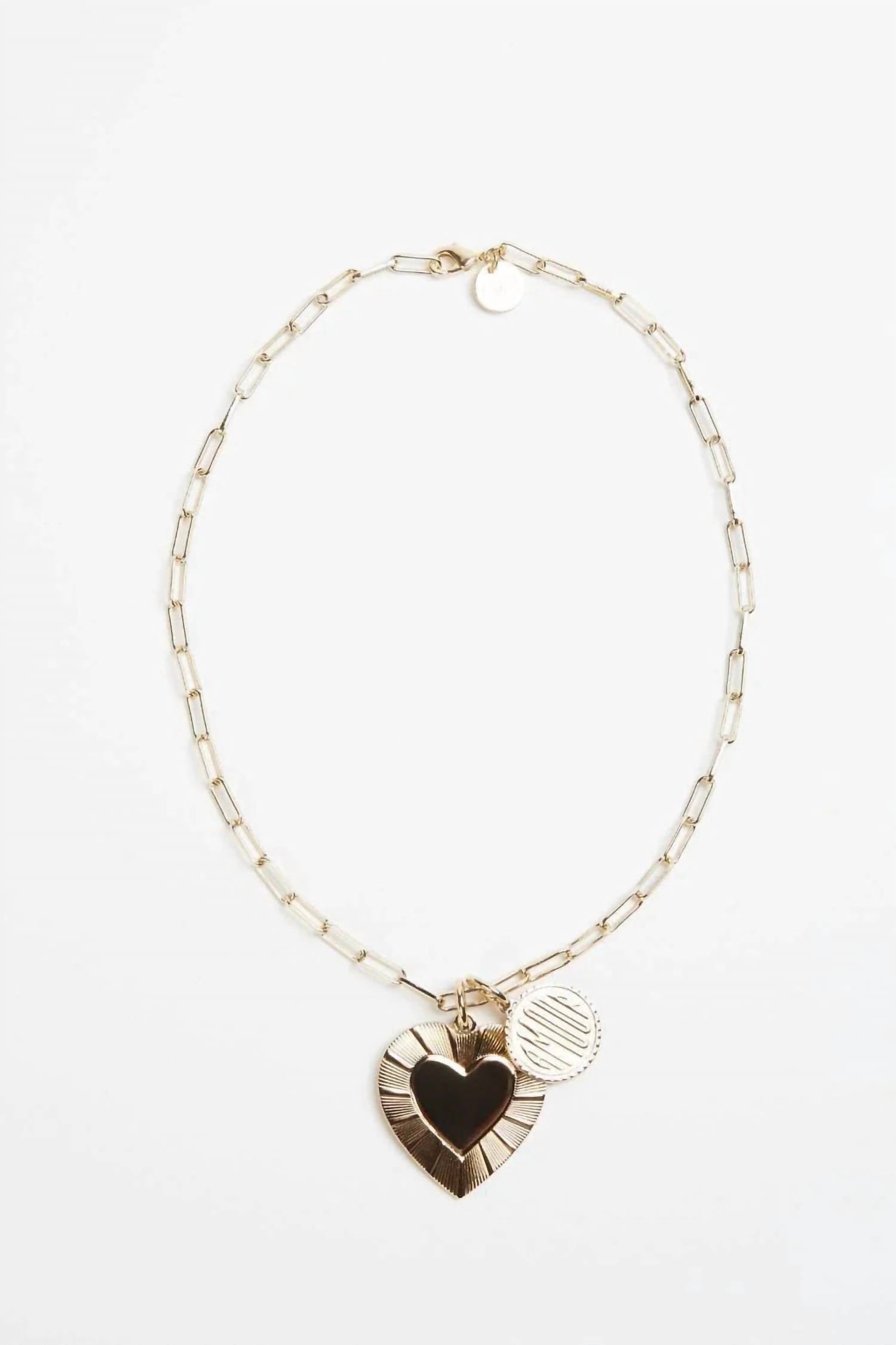 Introducing the Hildegard Pendant by Eklexic, a luxurious addition to your accessory collection in stunning silver. This heart-shaped pendant measures 1.25" long by 1.25" wide and is crafted from recycled brass with a 14K gold-plated finish, showcasing eco-conscious craftsmanship. Proudly handmade in the USA, it features a protective clear coating to preserve its long-lasting luster. Embrace the essence of elegance and sustainability with this statement piece.