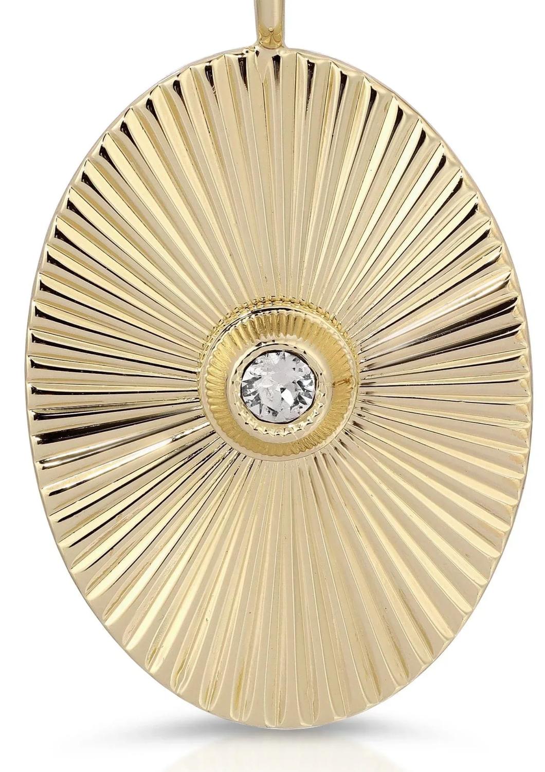 Illuminate your style with the Women's Ozzy Pendant by Eklexic, a gleaming accessory in Gold that exudes celestial elegance. This oval starburst pendant measures 1.5" long by 1.1" wide and is handmade in the USA from recycled brass, available in 14K gold or rhodium plating with a durable ecoat finish. At its heart, a sparkling Swarovski Crystal imparts dazzling brilliance and sophistication. Ideal for those who appreciate exquisite, sustainable jewelry that radiates refined beauty.