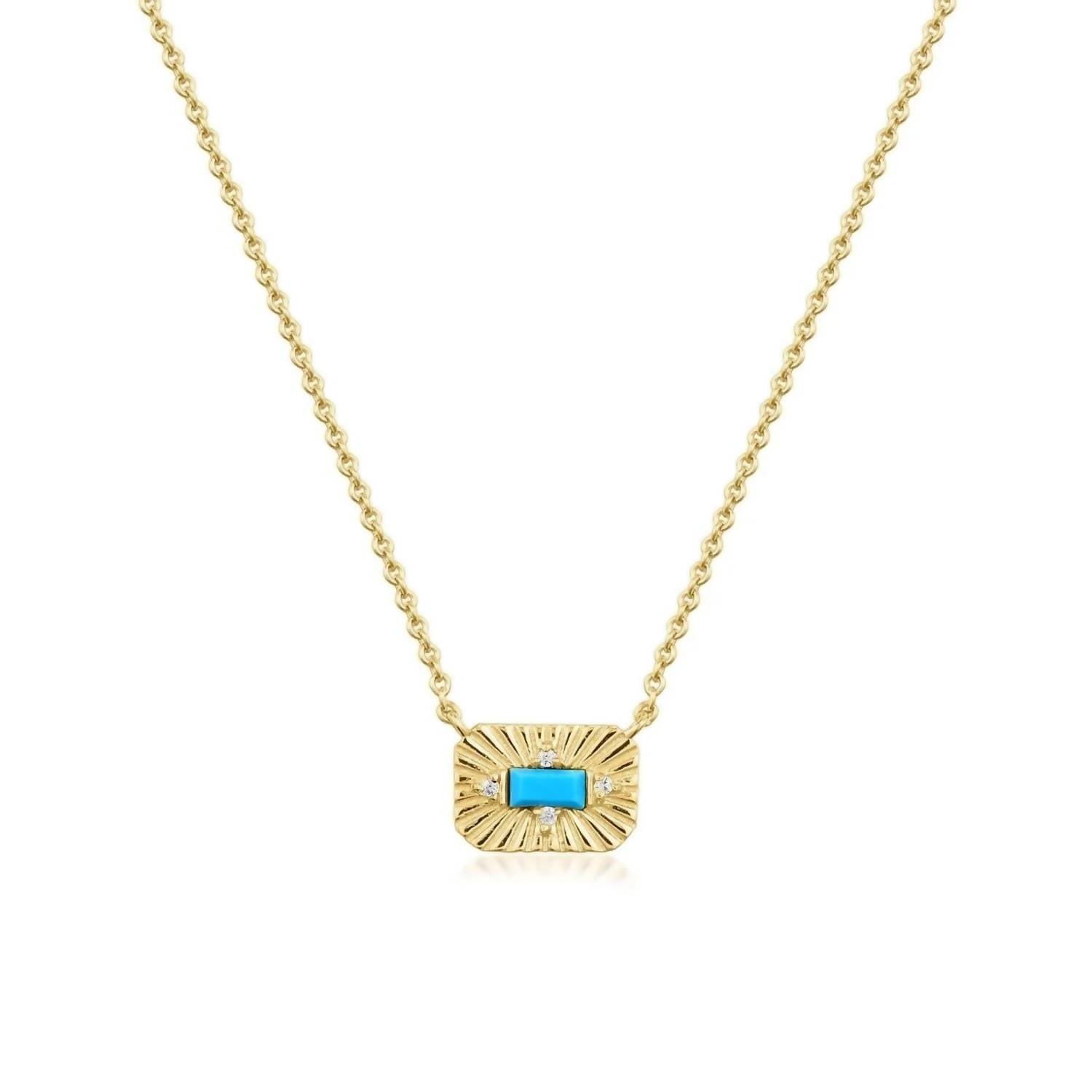 Layer this necklace or wear it on its own. Either way it's a win-win. Discover the Eklexic Women's Small Starburst Pendant With Turquoise Stone Necklace, an elegant piece that enhances your style effortlessly. This necklace features a radiant 14K Gold Vermeil finish, enriched with Cubic Zirconia gemstones, creating a fine jewelry masterpiece. The starburst pendant measures 10mm by 7mm by 1.2mm and beautifully complements the stunning turquoise stone, sized at 1.5mm by 1.8mm by 4mm. With a versatile 16-inch length and an additional 2-inch extender, it's perfect for layering or wearing alone for a sophisticated touch.