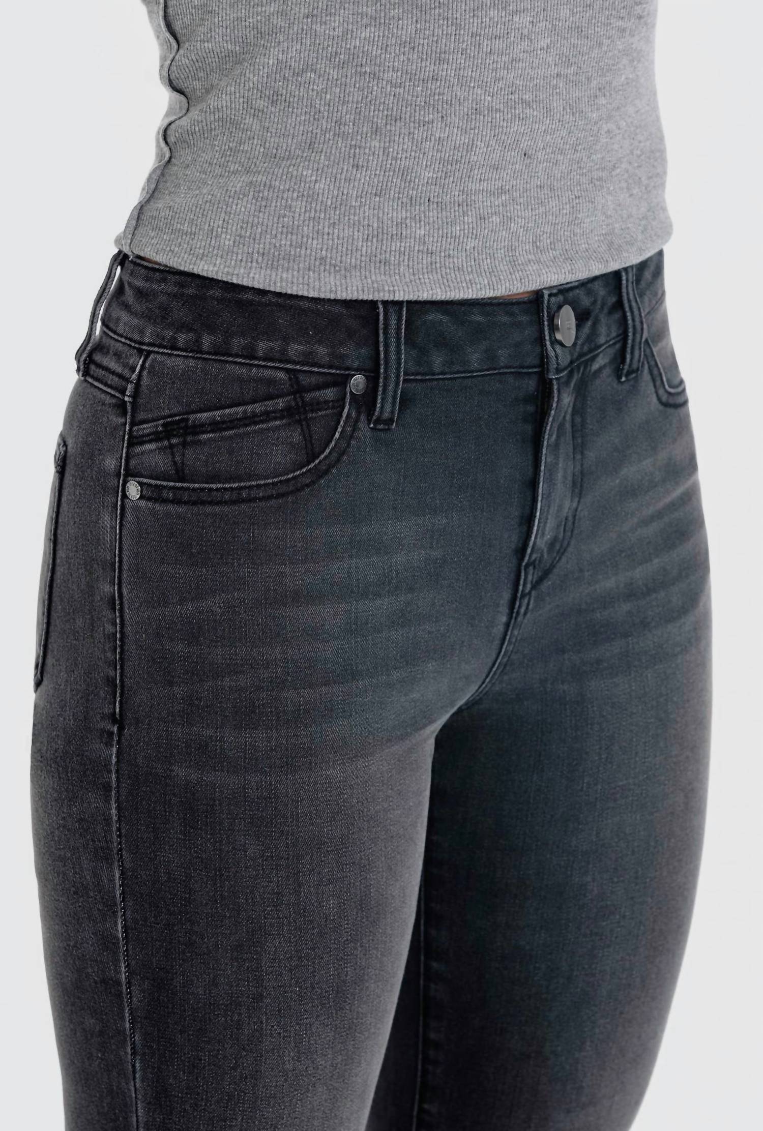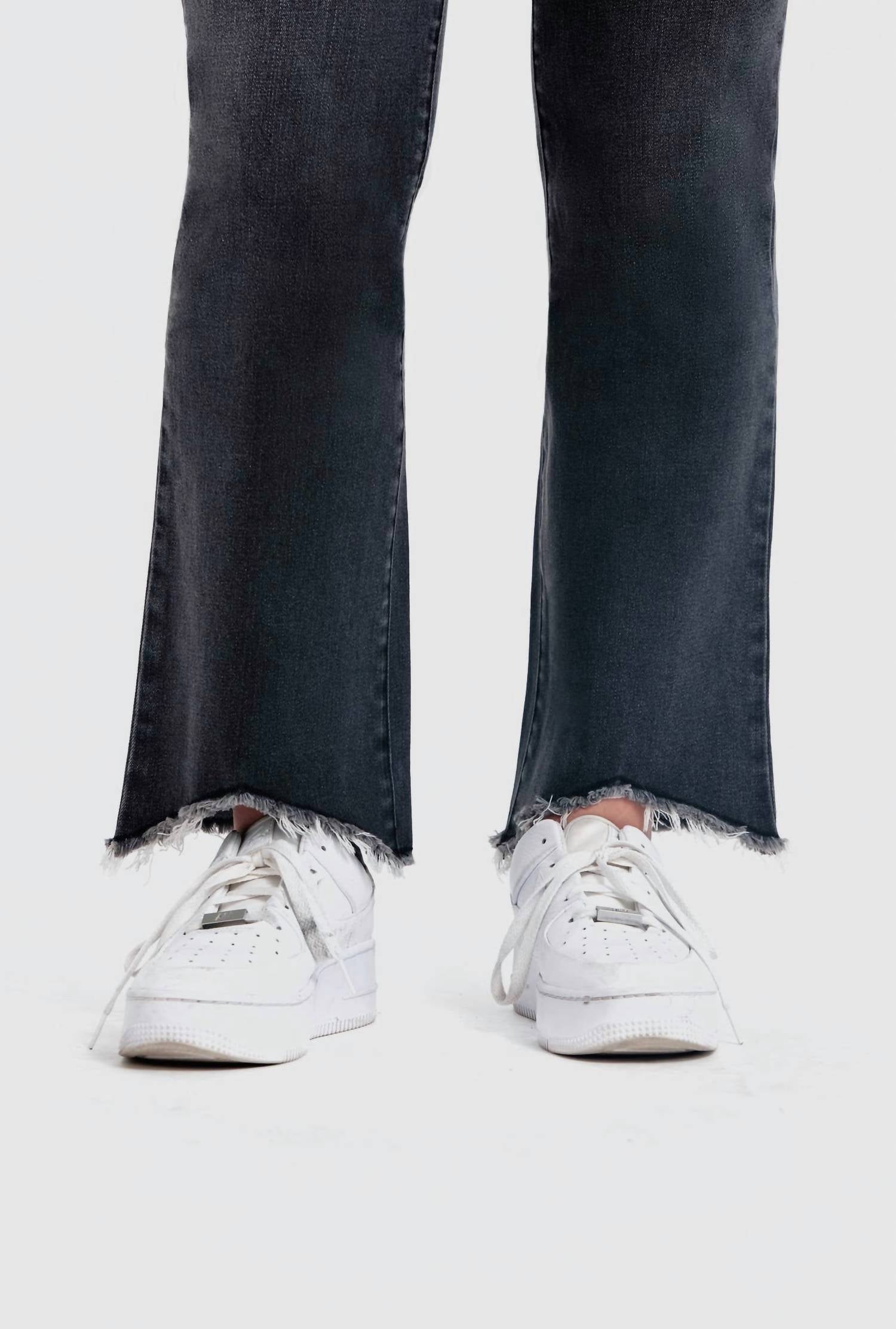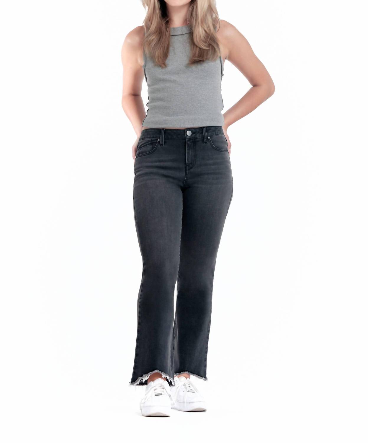 We especially love this cropped jean with a cute pair of slides or sandals. Elevate your style with the Women's Hi-low Fray Hem Ankle Boot Jean by 1822 Denim in a chic faded black wash. This high-rise, bootcut leg jean features a relaxed fit with a classic 5-pocket design and a stylish hi-low fray hem. Made with stretch material for comfort and great recovery, these jeans feature a front rise of 10" and a leg opening of 19", with an inseam ranging from 29" to 25". Originating from a focus on trendy streetwear, they close with a button and are machine washable, making them a practical choice for spring and back-to-school occasions.