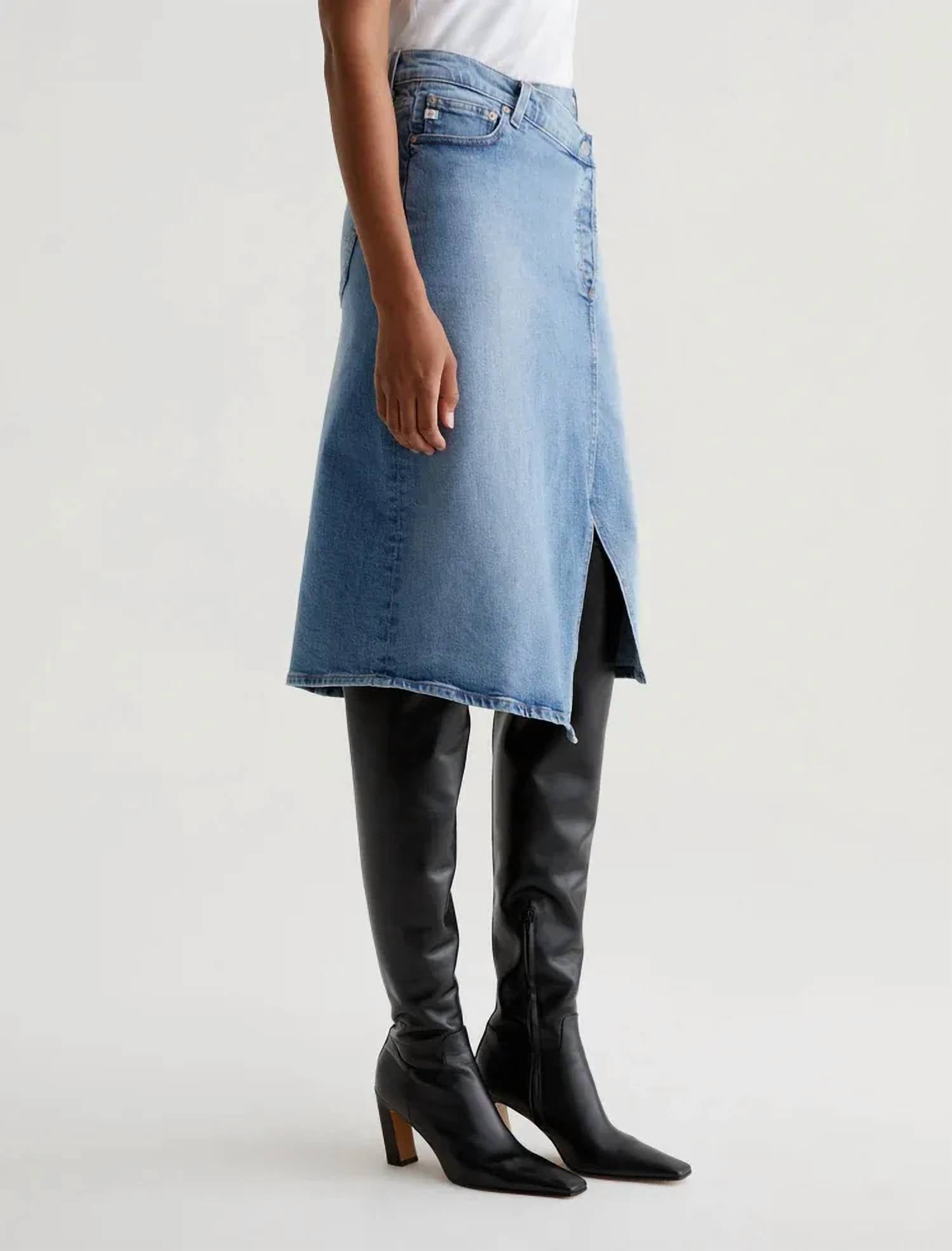 The midi length skirt is here to stay and we especially love this style. A twist on the classic wrap skirt. The Bruna denim midi skirt utilizes traditional five-pocket details in a deconstructed design with an asymmetrical wrap-front button-closure and an alluring front split. Made from 11.75 oz. Vintage Comfort Stretch Denim, the style comes in a light-blue wash with an allover AG-ed™ fade that emulates 18 years of wear. Finished with a godet at the back for added shape and room to move. 98% Cotton, 2% Elastane