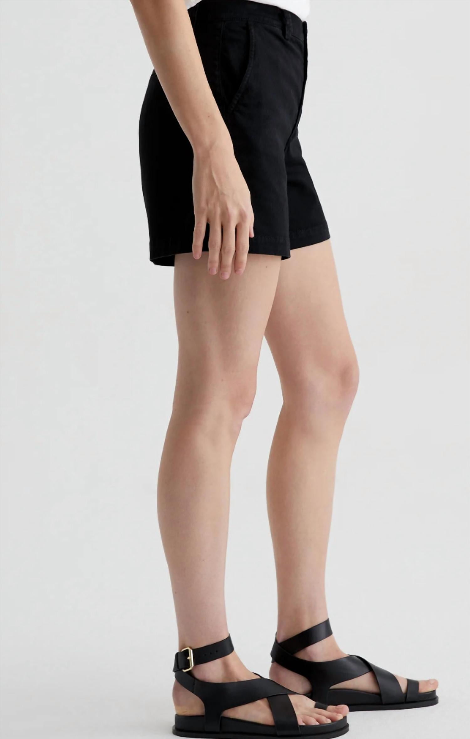 Fit to perfection, we love these high-waist shorts and you will too. Introducing the Jude Shorts by AG Jeans, a perfect blend of style and comfort for your spring and summer wardrobe. These shorts feature a button closure and a relaxed fit through the hips with a wider leg opening for added comfort. Crafted from sumptuous stretch broken twill, it boasts a composition of 54% cotton, 43% lyocell, and 3% elastane, weighing 7.5 oz. Care instructions: Machine wash and tumble dry. Dimensions include a front rise of 10 1/4", a bottom opening of 24", and a 5" inseam. These are the effortless choice for a minimalist look in Sulfur Black.