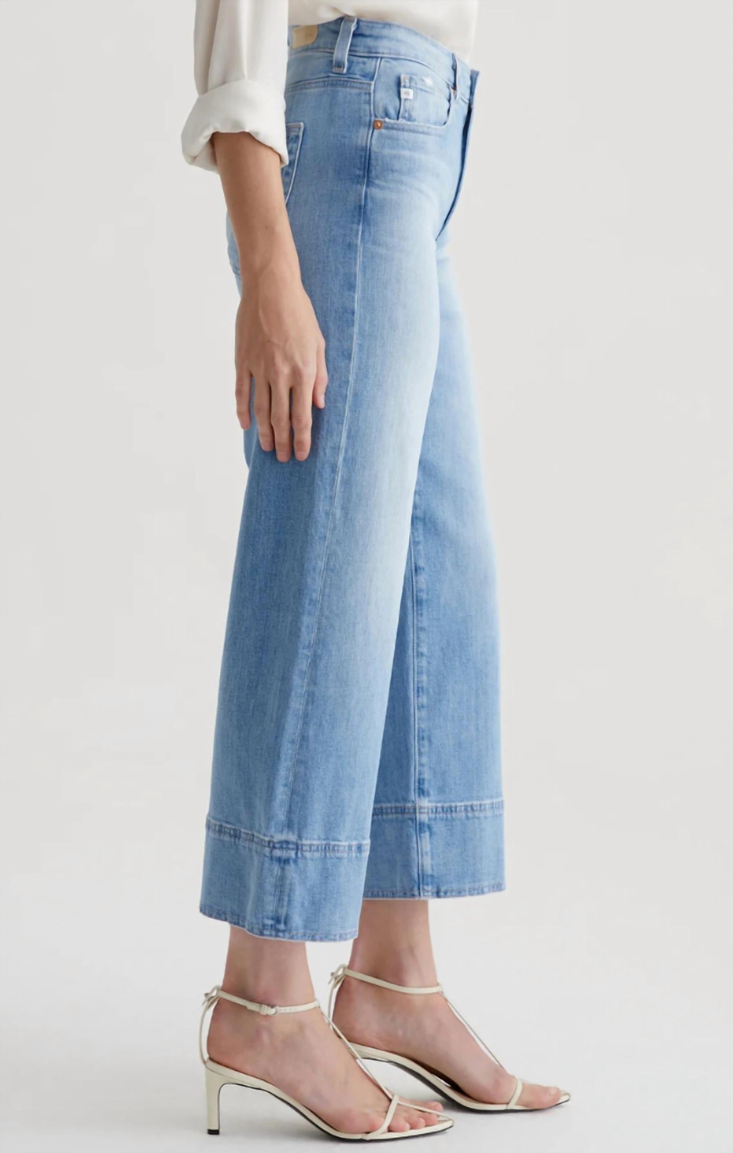 A flattering silhouette that's suprisingly versatile. Elevate your denim collection with the Saige Mid Rise Wide Leg Crop Jean by AG Jeans, a stylish choice for casual dinners and workwear. These women's jeans feature a mid-rise waist and a relaxed fit with a wide leg style, ideal for pairing with your favorite top. Crafted from a stretch-blend Journey Denim from Italy, they're made of 98% Cotton and 2% Elastane for comfort and durability. The light wash with faded details comes with a button closure, and these jeans are machine washable and safe for tumble drying. Dimensions include a front rise of 10 1/4", a knee opening of 20 1/4", a bottom opening of 21", and an inseam of 27". With subtle distressing at the pockets, these jeans are perfect for the season's trends.