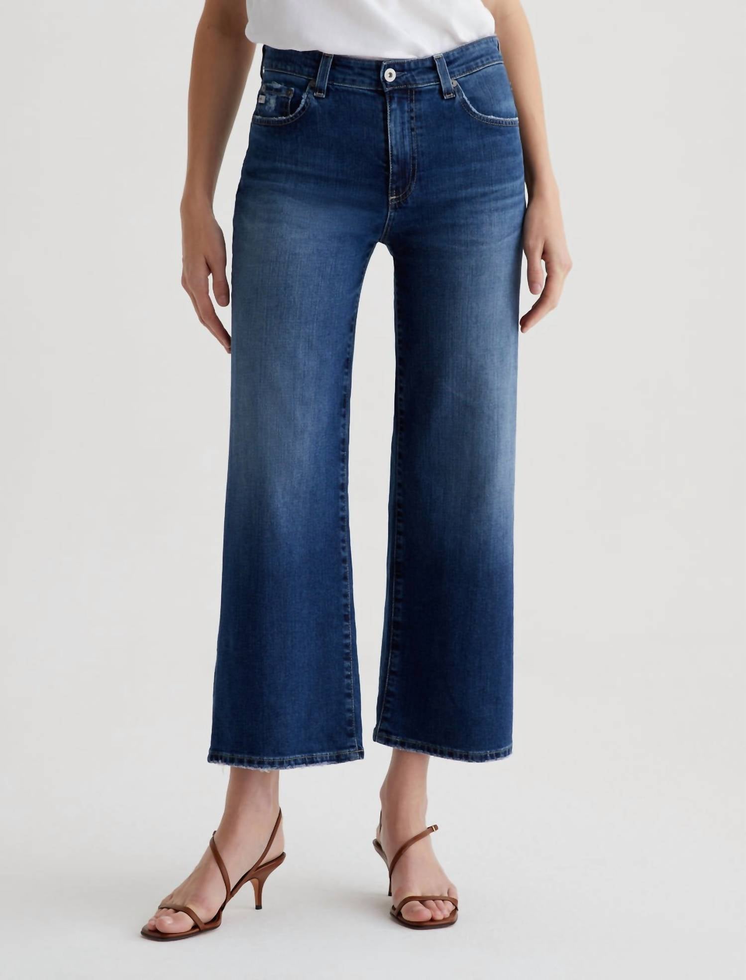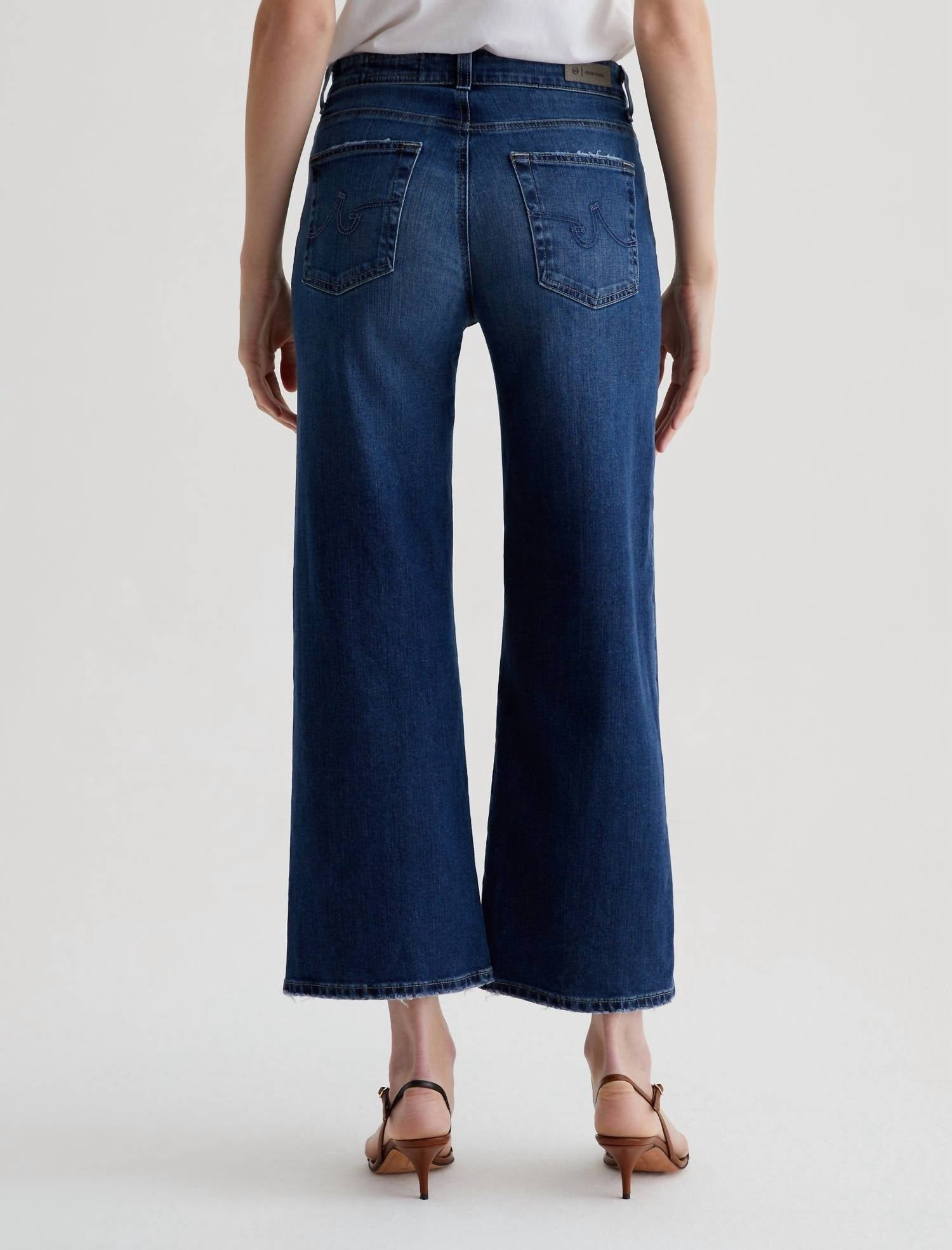 Pair these wide leg jeans with mules, slides or your favorite strappy sandals. Introducing the Saige Wide Leg Crop by AG Jeans, a stylish choice for women looking to embrace a relaxed fit in classic denim fashion. These mid-rise jeans feature a comfortable 11 oz. Lead Denim composition, made of 98% cotton and 2% polyester, ensuring a hint of comfort stretch. The pants sport a chic medium wash with characteristic fading and whiskering, complemented by a zip closure and five-pocket design. With a cropped ankle-baring 27" inseam and a wide leg style, these jeans are perfect for fall streetwear or Thanksgiving travel. Simply machine wash and tumble dry.