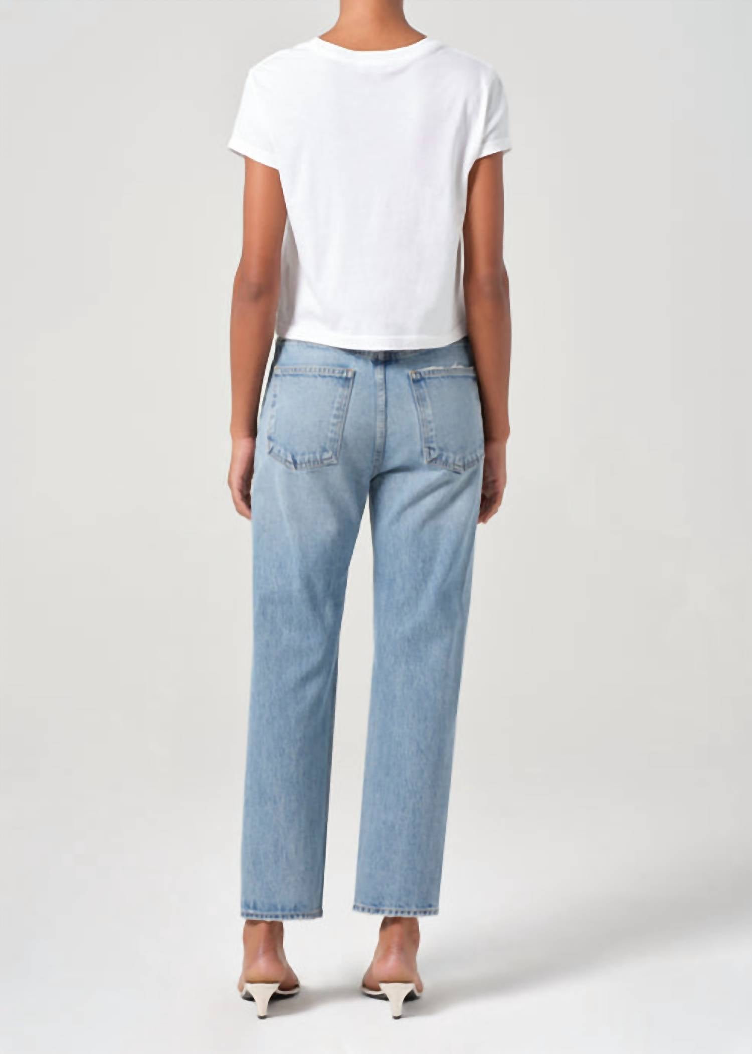A modern twist on a vintage silhouette, this 90’s-inspired jean features a high-rise waist with a fitted top block that highlights the hips, flowing into a classic straight leg. Made from rigid, non-stretch regenerative cotton, it offers authentic structure that softens with wear. Finished with a cropped inseam, it’s an ideal everyday jean.